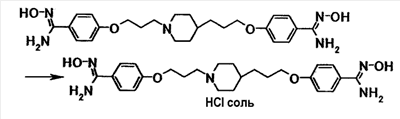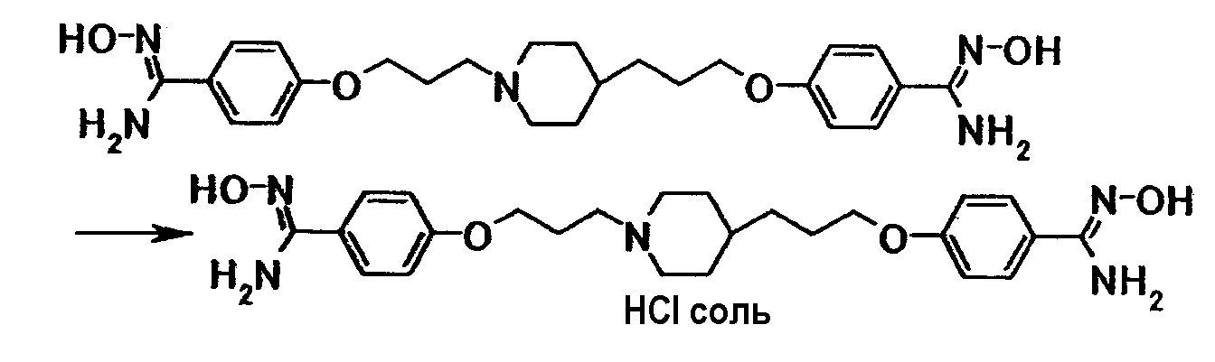 К суспензии 4,00 г 4-{3-[4-(3-{4-[амино(гидроксиимино)метил]фенокси}пропил)-1-пиперидинил]пропокси}бензамидоксима в 2-пропаноле (20 мл) добавляли при комнатной температуре 4 мл воды и 2,37 мл хлористоводородной кислоты, затем полученную смесь нагревали до температуры кипения с обратным холодильником в течение 3 минут. Смесь охлаждали до комнатной температуры, затем к полученной смеси добавляли при охлаждении льдом 10 мл 2-пропанола с последующим перемешиванием при указанной температуре в течение одного часа. Осадок собирали фильтрованием и промывали 90% (об/об) водным раствором 2-пропанола с получением 3,94 г гидрохлорида 4-{3-[4-(3-{4-[амино-(гидроксиимино)метил}фенокси}пропил)-1-пиперидинил]пропокси}бензамидоксима.