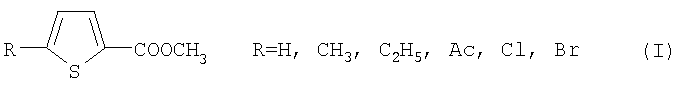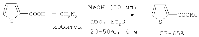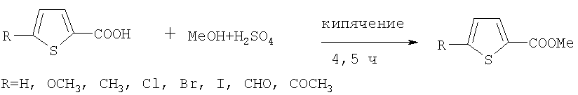 Метиловые эфиры 2-тиофенкарбоновой кислоты, замешенной в пятом положении, получают при их кипячении в метаноле в присутствии Н2SO4 в течение 4-4.5 часов (H.Satonaka. Bull. Chem. Soc. Jpn., v.56, 2463-2468 (1983) [6]).