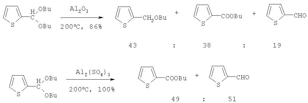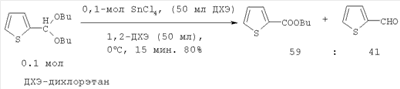 Изомеризацию и перегруппировку 2-тиофенацеталей катализируют эфират трехфтористого бора [(C2H5)2OBF3], или хлорид олова. Реакция проходит в среде дихлорэтана (S.Raja, N.Xavier, S.J.Arulraj. Indian J. Chem., Sect. В, 28В, 8, 687-689 (1989) [4]).