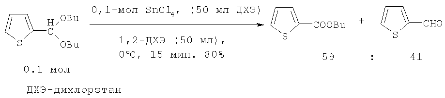 Раствор ацеталя (0,1 мол) в очищенном 1,2-дихлорэтане (50 мл) охлаждают до 0°С и добавляют свежеперегнанный катализатор (0,1 мол) в растворе 1,2-дихлорэтана (50 мл) капельно в течение 15 мин в безводных условиях, реакционную смесь выдерживают еще 15 мин, добавляют холодную воду, промывают смесь 5% водным раствором Na2СО3, водой до нейтральной среды, сушат Na2SO4 4 часа.