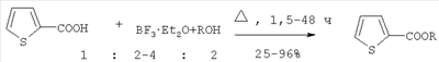 Эфиры 2-тиофенкарболовой кислоты (ТФК) получают этерификацией с помощью 2-4 эквивалента BF3·Et2O и избытком спирта ROH (R=С1-4-алкил и циклогексил) кипячением этой смеси в течение 1.25-48 ч (Kadaba, Pankaja K.Synthesis, 11, 628-630 (1972) [5]).