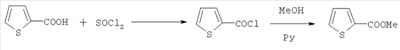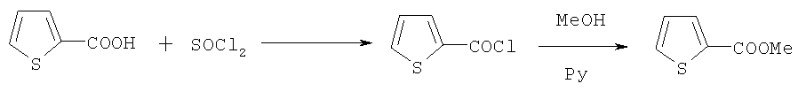 Метиловый эфир 2-тиофенкарбоновой кислоты получают из 2- тио-фенкарбоновой кислоты через хлорангидрид последовательной обработкой ее избытком тионилхлорида и затем метанолом в присутствии пиридина (R.Nato, G.Consiglio, A.Storace. J. Chem. Soc. Perkin Trans II, 15, 1805-1808 (1976) [7]).