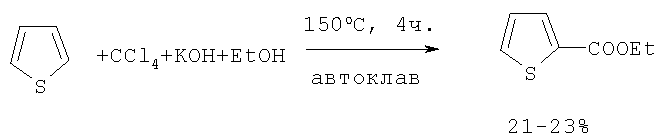 Для получения этилового эфира 2-тиофенкарбоновой кислоты смесь тиофена, четыреххлористого углерода (CCl4) и гидроксида калия (КОН) нагревали в течение 4 часов в этаноле при 150°С в автоклаве. После нейтрализации и перегонки в вакууме с выходом 23% был получен этиловый эфир 2-тиофенкарбоновой кислоты (K.L.Kreuz. Thiophene carboxylic acids. U.S. 2,552,978 (1951) [9]).