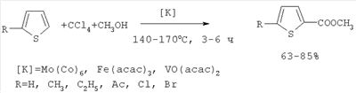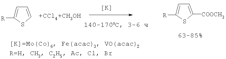 1. Для получения метиловых эфиров 2-тиофенкарбоновой кислоты из тиофена используют системы CCl4-СН3ОН-Мо(СО)6, CCl4-СН3ОН-Fe(асас)3, CCl4-СН3ОН-VO(асас)2, генерирующие in situ сильный окислитель метилгипохлорит.