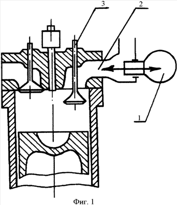 При открытии выпускного клапана 3 отработавшие газы поступают в выпускной канал 2 двигателя, в котором расположен резонатор Гельмгольца 1 (навстречу потоку отработавших газов), возбуждающий в потоке отработавших газов газодинамические колебания. Полученные газодинамические колебания интенсифицируют процесс тепломассопереноса около твердых частиц путем их обдува, в результате чего твердые частицы сгорают быстрее.