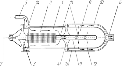 Перед вторым по ходу потока изолятором 4, очищаемый газ через отверстия 11 в электроде 9 попадают вовнутрь дополнительной камеры 8. Диоксиды азота частично абсорбируются, частично восстанавливаются до молекулярного азота в дополнительной камере 8, заполненной катализатором – сорбентом, полностью находящимся в области слабонеоднородного электрического поля между потенциальным электродом 9 и периферийным электродом 10.