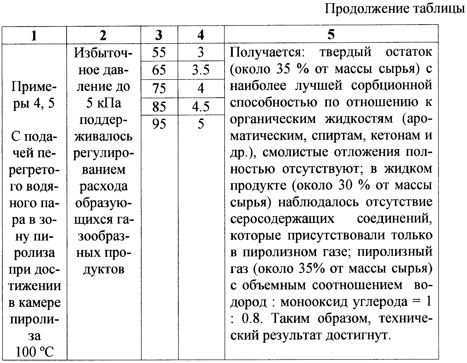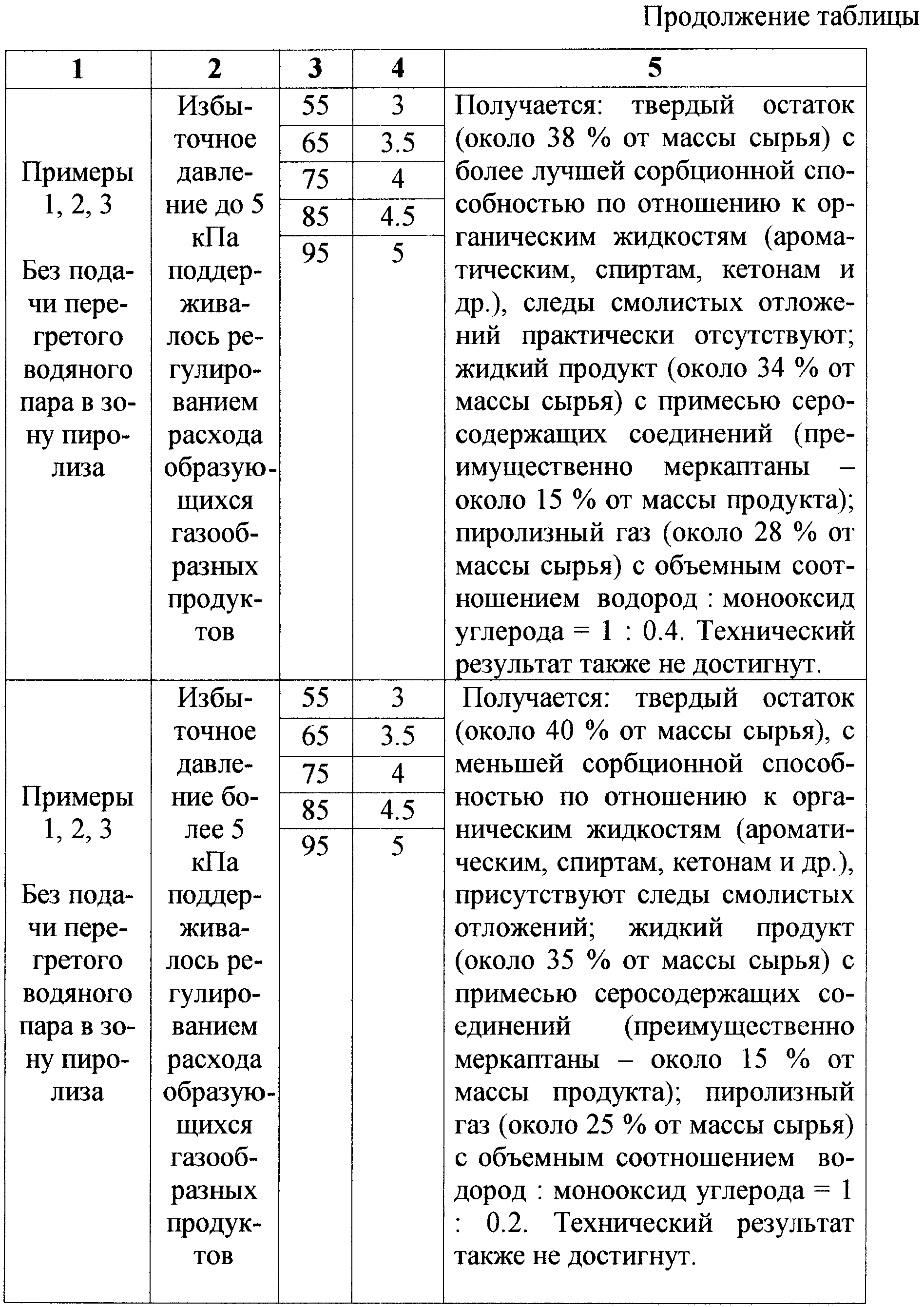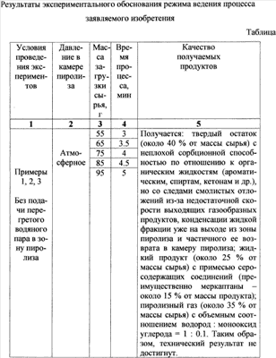 Также проводились опыты с подачей перегретого водяного пара в зону пиролиза при тех те же массах загрузки сырья (55-95 г) и том же времени его переработки (3-5 мин) при избыточном давлении в камере пиролиза до 5 кПа. Расход пара, подаваемого в зону пиролиза при достижении 100°С, составлял примерно 20% от массы загрузки сырья и был необходим для создания окислительно-восстановительной среды, стабилизации температуры в зоне пиролиза и увеличения скорости движения газового потока образующихся газообразных продуктов. Подача перегретого водяного пара приводила к отсутствию смолистых отложений в твердом остатке пиролиза и отсутствию серосодержащих соединений в жидком продукте пиролиза, а все серосодержащие соединения (преимущественно сероводород и оксиды серы) содержались только в пиролизном газе. Подача перегретого водяного пара в зону пиролиза также способствовала частичной газификации образующегося углерода в твердом остатке, на что указывало уменьшение массы твердого остатка (около 35% от массы сырья), увеличение выхода пиролизного газа (до 35% от массы сырья) и увеличение содержания в нем монооксида углерода и водорода, при этом соотношение водород:монооксид углерода доходило до 1:0,8. Твердый остаток при этом обладал наилучшими сорбционными свойствами к органическим жидкостям (описанным выше) по сравнению твердым остатком, полученным в режимах без подачи перегретого водяного пара, а содержание углерода в нем достигало 90%. Таким образом, при данных условиях ведения процесса желаемый результат по качеству конечных продуктов был достигнут.