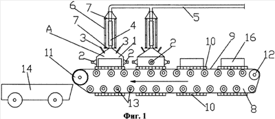 На фиг.2 на транспортерной ленте 8 схематично показаны звенья 15, на которых расположены микроволновые затворы 10.