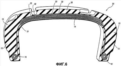 Фиг.6 – вид в сечении в увеличенном масштабе шины с фиг.1, на котором заштрихован участок, образуемый из эластомерного материала, и на котором показаны слои, брекеры и прокладки, установленные между слоями и брекерами, при этом на верхней части шины имеется протектор;