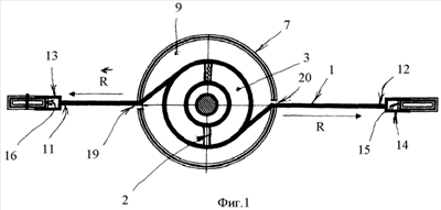 Перечень цифровых и буквенных обозначений: ремень (1); пазы (2 и 19); цилиндрический выступ (3) поворотного комбинированного вала (4); ленточные спиральные пружины (5 и 6); внешние поверхности (7 или 8); сборный оболочковый корпус (9 и 10); конец ремня (11); приторцовая зона ремня (12); петли (13); фиксатор пружины (14); ушко (15 или 16); буксировочный крюк (17 или 18); резьбовой цилиндрический выступ (21); глухие пазы (22 и 23); ось (24); пластины (25 и 26); поверхности отверстий (27 и 28); ступенчатый вал (29); буксировочный крюк (30); опорная шайба (31); гайка (32); шайба (33); разрезные корончатые шайбы (34); оребрение (35); вкладыши и/или подшипники (36); сборное натяжное устройство (37).