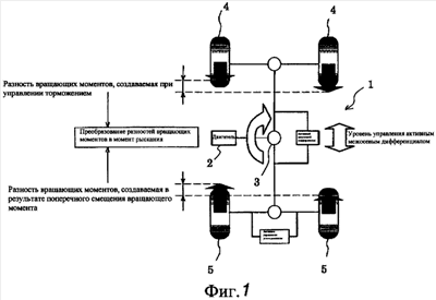 Как показано на фиг. 1, в транспортном средстве 1 тяговое усилие двигателя 2 распределяется на передние колеса 4 и задние колеса 5 при помощи межосевого дифференциала (центрального дифференциала) 3, таким образом, с обеспечением управления интенсивностью сил дифференциального ограничения, прилагаемых к передним и задним колесам (величиной управления активным межосевым дифференциалом). Кроме того, разность моментов, относящаяся к управлению правым и левым тормозами, воздействующими на передние колеса 4, и разность моментов, относящаяся к смещающему моменту между правым и левым задними колесами 5, преобразуются в момент рыскания, и момент рыскания принят как управляемая величина момента рыскания транспортного средства 1 (величина управления моментом рыскания транспортного средства). Устройство отображения характеристик при повороте, соответствующее настоящему изобретению, должно отображать на индикаторе интенсивность силы дифференциального ограничения, прилагаемой к передним и задним колесам (величины управления активным межосевым дифференциалом), и величины управления моментом рыскания.