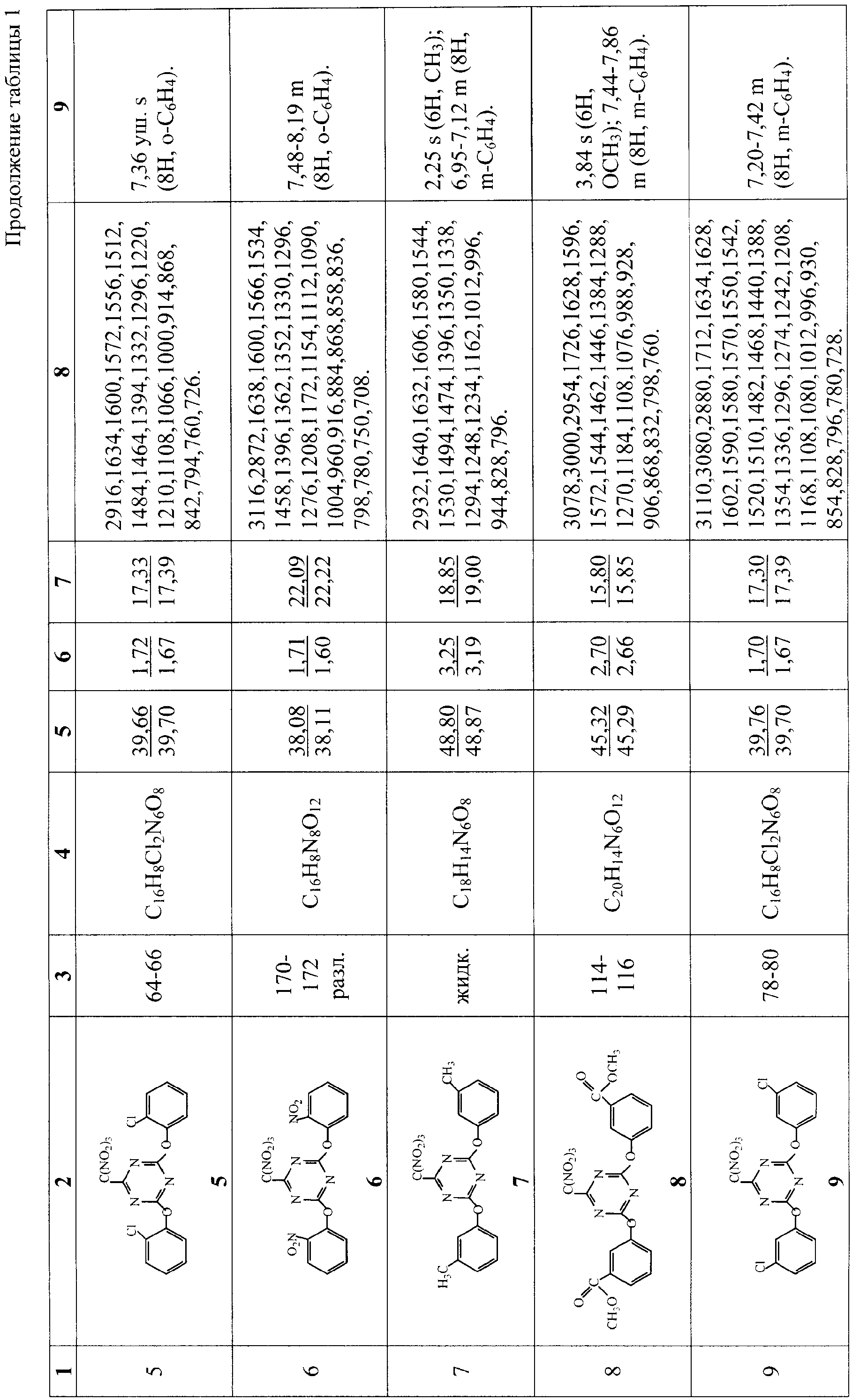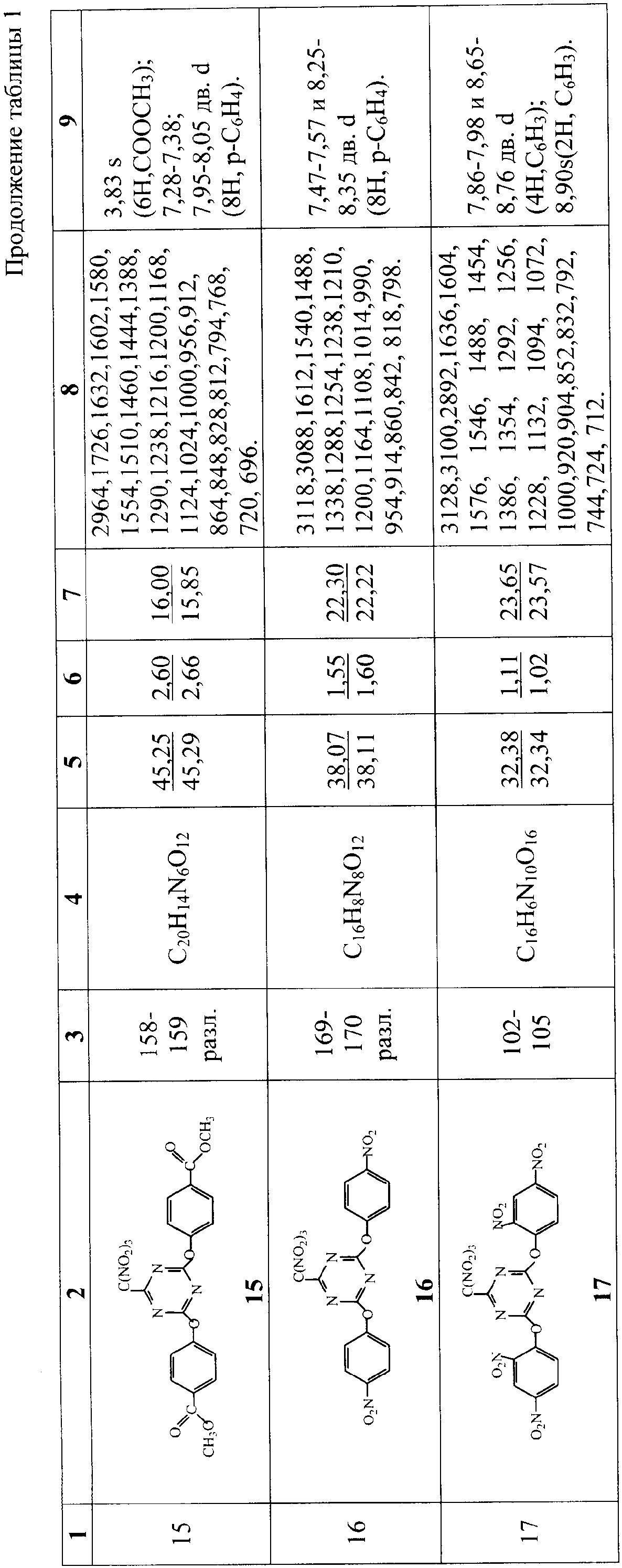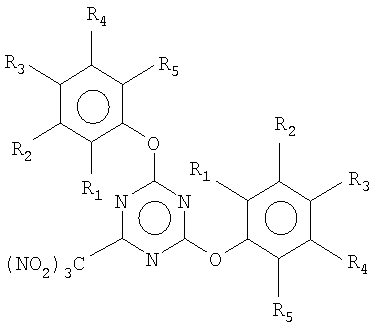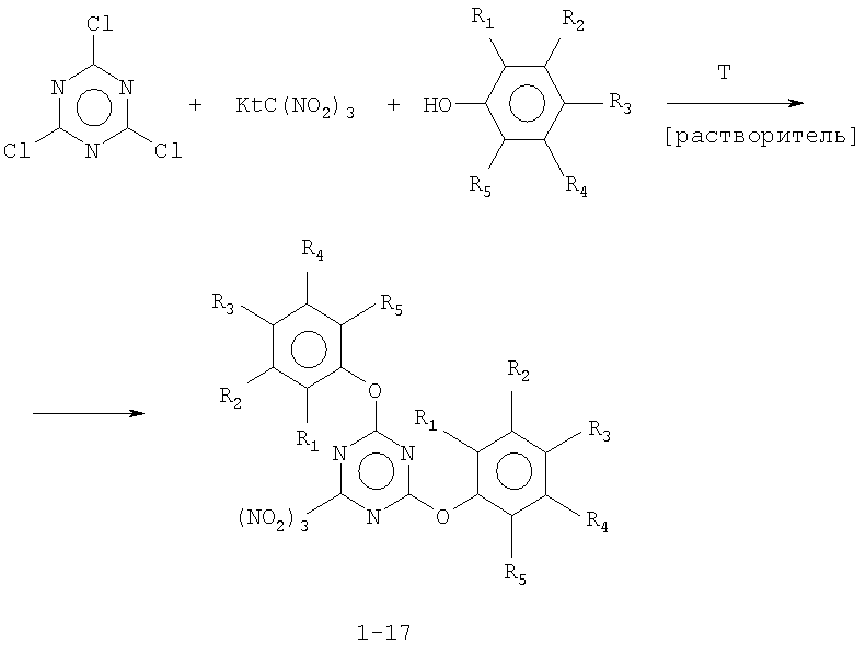 Известный способ (способ-аналог; способ-прототип не обнаружен) введения арилоксигрупп в цикл 1,3,5-триазина заключается во взаимодействии производных 1,3,5-триазина с фенолом или замещенными фенолами, протекающем в присутствии оснований. Взаимодействие 2,4,6-трихлор-1,3,5-триазина (цианурхлорида) с фенолом и замещенными фенолами в среде органических растворителей в присутствии оснований сопровождается в зависимости от количества взятого в реакцию фенола образованием моно-, ди- и триарилоксизамещенных 1,3,5-триазинов [3, 4] [3. Quirke J.M.E. 1,3,5-Triazines. In Comprehensive Heterocyclic Chemistry. Vol.3. Pt. 2B. (Eds. KatrizkyA.R., Rees C.W.) – Oxford: Pergamon Press, 1984. – P. 457-530. 4. Погосян Г.М., Панкратов В.А., Заплишный В.Н., Мацоян С.Г. Политриазины. – Ер.: Издательство АН АрмССР, 1987. – 615 с.]. Взаимодействие 2-амино(алкокси)-4,6-бис(тринитрометил)-1,3,5-триазинов с фенолом и замещенными фенолами в среде органических растворителей в присутствии оснований сопровождается образованием 2-амино(алкокси)-4-арилокси-6-тринитрометил-1,3,5-триазинов [1]. Таким образом, известны способы получения арилоксипроизводных 1,3,5-триазина, содержащих две арилоксигруппы в сочетании с другим заместителем (но не тринитрометильной группой) и содержащих одну арилоксигруппу и одну тринитрометильную группу в сочетании с другими заместителями (но не арилоксигруппой). Однако получение 2,4-диарилокси-6-тринитрометил-1,3,5-триазинов по способу-аналогу в литературе не описано. Техническим результатом изобретения является получение 2,4-диарилокси-6-тринитрометил-1,3,5-триазинов непосредственно из цианурхлорида в одну стадию. Технический результат достигается проведением реакции между цианурхлоридом, солями тринитрометана и фенолом или замещенными фенолами в органическом растворителе. R1-R5=H (1,33%); R1=СН3, R2-R5=H (2,20%); R1=COOCH3, R2-R5=H (3,20%); R1=I, R2-R5=H (4,25%); R1=Cl, R2-R5=H (5,23%); R1=NO2, R2-R5=H (6,35%); R1=H, R2=СН3, R3-R5=H (7,40%); R1=H, R2=COOCH3, R3-R5=Н (8,54%); R1=H, R2=Cl, R3-R5=H (9,52%); R1=H, R2=NO2, R3-R5=Н (10,59%); R1-R2=H, R3=СН3, R4-R5=H (11,49%); R1-R2=H, R3=С(СН3)3, R4-R5=H (12,50%); R1-R2=H, R3=Сl, R4-R5=H (13,56%); R1-R2=H, R3=Вr, R4-R5=H (14,60%); R1-R2=H, R3=СООСН3, R4-R5=H (15,56%); R1-R2=H, R3=NO2, R4-R5=H (16,65%); R1=NO2, R2=H, R3=NO2, R4-R5=H (17,27%). Kt+=K+, Na+, NH4 Выход 2,4-диарилокси-6-тринитрометил-1,3,5-триазинов составляет 20-65% от теории. В качестве органических растворителей для проведения реакции можно использовать ацетонитрил, ацетон. Реакцию можно проводить при температурах от -20°С до +40°С. Порядок смешения реактантов (цианурхлорид, соль тринитрометана, фенол или замещенные фенолы) не имеет существенного значения. Для лучшего понимания предлагаемого способа рассмотрим пример синтеза 2,4-диарилокси-6-тринитрометил-1,3,5-триазинов. Пример 1. К раствору 1,84 г (0,01 моль) цианурхлорида в 16 мл ацетона при перемешивании и температуре 18-22°С присыпают 0,04 моля соли тринитрометана Kt+C(NO2)3 Таким образом, предлагаемый способ позволяет: – получать 2,4-диарилокси-6-тринитрометил-1,3,5-триазины из цианурхлорида, солей тринитрометана и фенола или замещенных фенолов в одну стадию.
