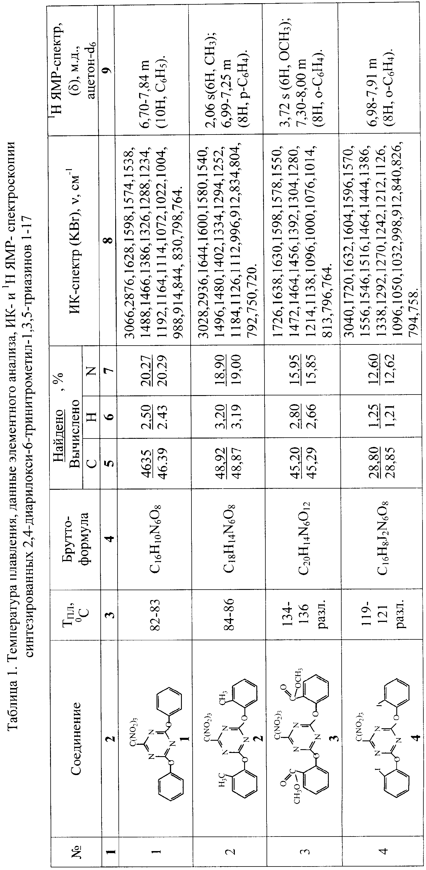 Изобретение относится к области химии нитрометильных производных гетероцикла 1,3,5-триазина, конкретно – к способу получения 2,4-диарилокси-6-тринитрометил-1,3,5-триазинов общей формулы:
