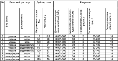 Пример 4. Аналогичен примеру 1, кроме того, что использовался водно-спиртовой (2% спирта) белковый раствор и частота магнитного поля составляла 34 Гц.