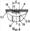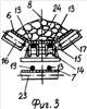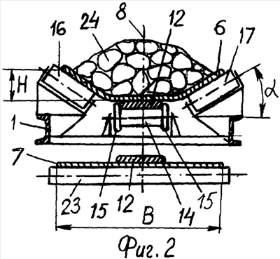 где Н – превышение бортовых кромок ленты над верхней кромкой тягового контура, м; В – ширина ленты, м; – угол наклона к горизонту роликов для ленты, рад; b – расстояние по горизонтали между наружными кромками тягового контура, м. Приводной 9 и натяжной 10 шкивы выполнены в виде кольцевых углублений 19 трапецеидального поперечного сечения в цилиндрических обечайках барабанов 4 и 5, ориентированных по продольной оси 8 конвейера. Контур ленты на ее нерабочей ветви 7 дополнительно снабжен вертикальным натяжным устройством, состоящим из двух оборотных 20, 21 и натяжного 22 барабанов. Вертикальное натяжное устройство для ленты может быть размещено в наиболее удобном месте на нерабочей ветви 7 ленты при проектировании конвейера, 23 – роликоопора для нерабочей ветви 7 ленты, 24 -транспортируемый груз, 25 – направление движения грузонесущей ветви 6 ленты.