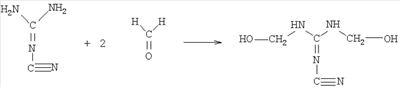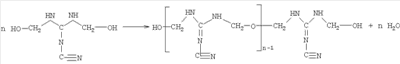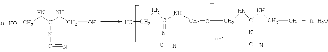 Можно также использовать полимеры типа полиакриламида, модифицированные реакцией Манниха, такие как полиакриламид, N-замещенный диметиламинометиловой группой. Можно также использовать катионные полимеры, полученные поликонденсацией дициандиамида и формальдегида. Эти полимеры и способы их получения описаны в патенте FR 1042084. Таким образом, объектом настоящего изобретения является также способ нейтрализации глин в песках, предназначенных для приготовления гидравлических композиций, отличающийся тем, что во время подготовки песка его соединяют с полимером, который можно получить конденсацией дициандиамида с формальдегидом, в случае необходимости, в присутствии других соединений. Согласно предпочтительному варианту выполнения полимер можно получать конденсацией дициандиамида с формальдегидом в присутствии A) полиалкиленгликоля; и/или B) полиалкоксилированного поликарбоксилата; и/или C) производного аммония. Точный химический состав полученного таким образом полимера не известен. Поэтому он будет в дальнейшем описан в основном в связи со способом его получения. Способ получения Полимер можно получить путем конденсации дициандиамида с формальдегидом, в случае необходимости, в присутствии других соединений, в частности полиалкиленгликоля (А), полиалкоксилированного поликарбоксилата (В) и/или агента кватернизации (С). Реакция конденсации между дициандиамидом и формальдегидом требует 2 молей формальдегида на 1 моль дициандиамида согласно следующей схеме (I) реакции: Таким образом, молярное соотношение между формальдегидом и дициандиамидом предпочтительно находится в диапазоне от 0,8:1 до 4:1, в частности от 1:1 до 3:1. Молярный избыток, превышающий 4, не дает дополнительных преимуществ, но зато может привести к нежелательному схватыванию. Предпочтительно проводить реакцию с небольшим стехиометрическим избытком формальдегида при молярном соотношении между формальдегидом и дициандиамидом, находящимся в диапазоне от 2,2:1 до 2,8:1. Предпочтительно полимер получают путем конденсации формальдегида с дициандиамидом в присутствии дополнительных соединений. Действительно, это позволяет модулировать свойства полимера, в частности его растворимость в воде и его сродство к глинам. Полиалкиленгликоль (соединение А) предпочтительно имеет формулу (I):