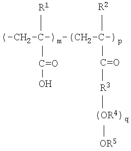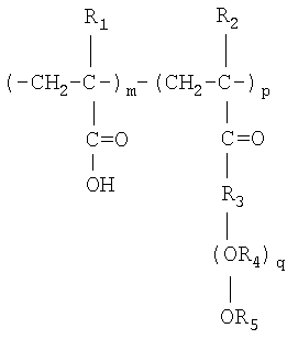 где R1 – алкильная группа с C1-C4, предпочтительно этиловая группа и/или пропиловая группа; R2 и R3 являются независимо друг от друга атомом водорода или алкильной группой с C1-C4, предпочтительно метиловой группой; и n – число от 25 до 1000. Например, речь может идти о полиэтиленгликоле, о полипропиленгликоле, о сополимере этиленоксида/пропиленоксида или о смеси этих различных соединений. Предпочтительно речь идет о полиэтиленгликоле. Молекулярная масса соединения А предпочтительно составляет от 1000 до 35000. Путем замеров вязкости было установлено, что присутствие соединения А изменяет структуру образованного полимера, а также его свойства. Количество соединения А, используемого в реакции в случае необходимости, в принципе меньше количества главных реагентов – дициандиамида и формальдегида. Так, реакционная смесь обычно содержит 0-10 мас.%, предпочтительно 0,5-3 мас.%, в частности 0,8-1 мас.%, соединения А. Полиалкоксилированный поликарбоксилат (соединение В) является гребенчатым полимером, содержащим главную водородно-углеродную цепочку, с которой связаны одновременно боковые карбоксильные группы и алкоксильные группы, в частности группы пропиленоксида (РО), группы этиленоксида (ЕО) и/или их комбинации. Боковые группы могут быть ионными или неионными. Предпочтительно речь идет о соединении, имеющем следующую формулу (II):