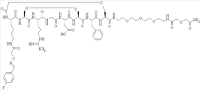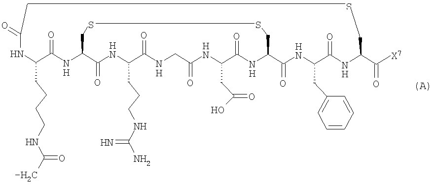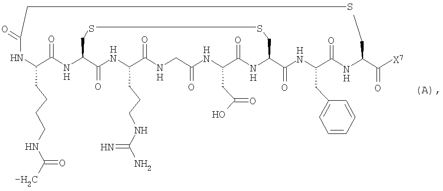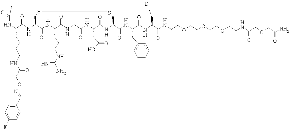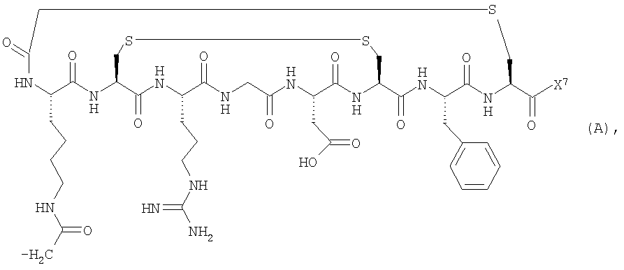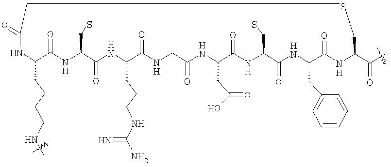 25. Способ мониторинга эффекта лечения организма человека или животного лекарством для борьбы с состоянием, ассоциированным с раком, предпочтительно ангиогенезом, включающий введение в указанный организм соединения по любому из пп.17-20 и детектирование захвата указанного конъюгата клеточными рецепторами, причем указанное введение и детектирование возможно, но предпочтительно осуществляют до, во время и после лечения указанным лекарством.
