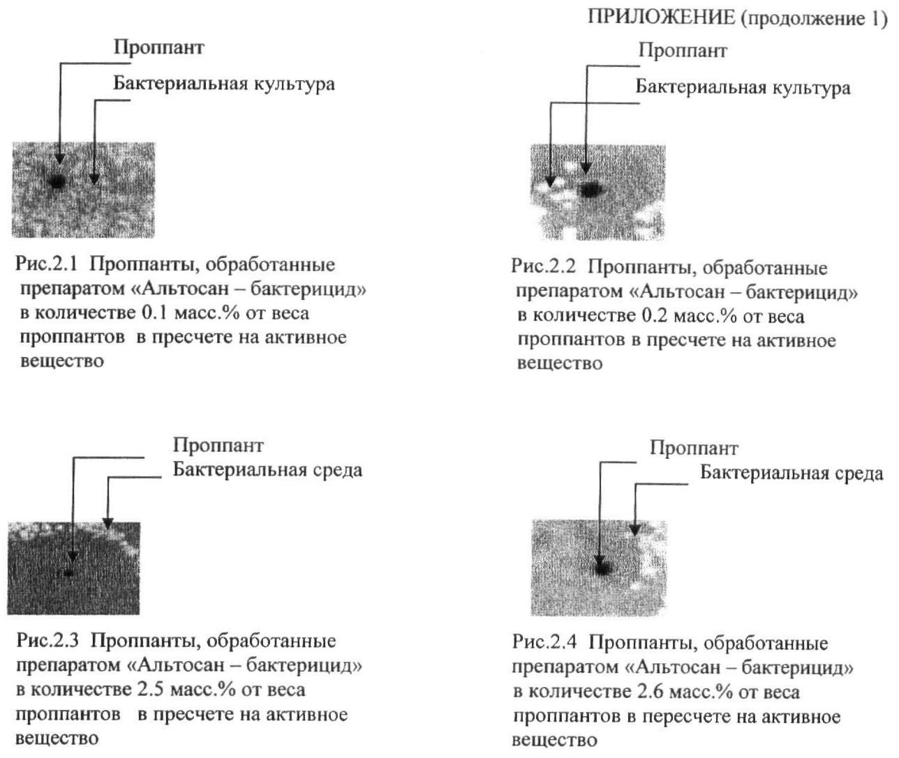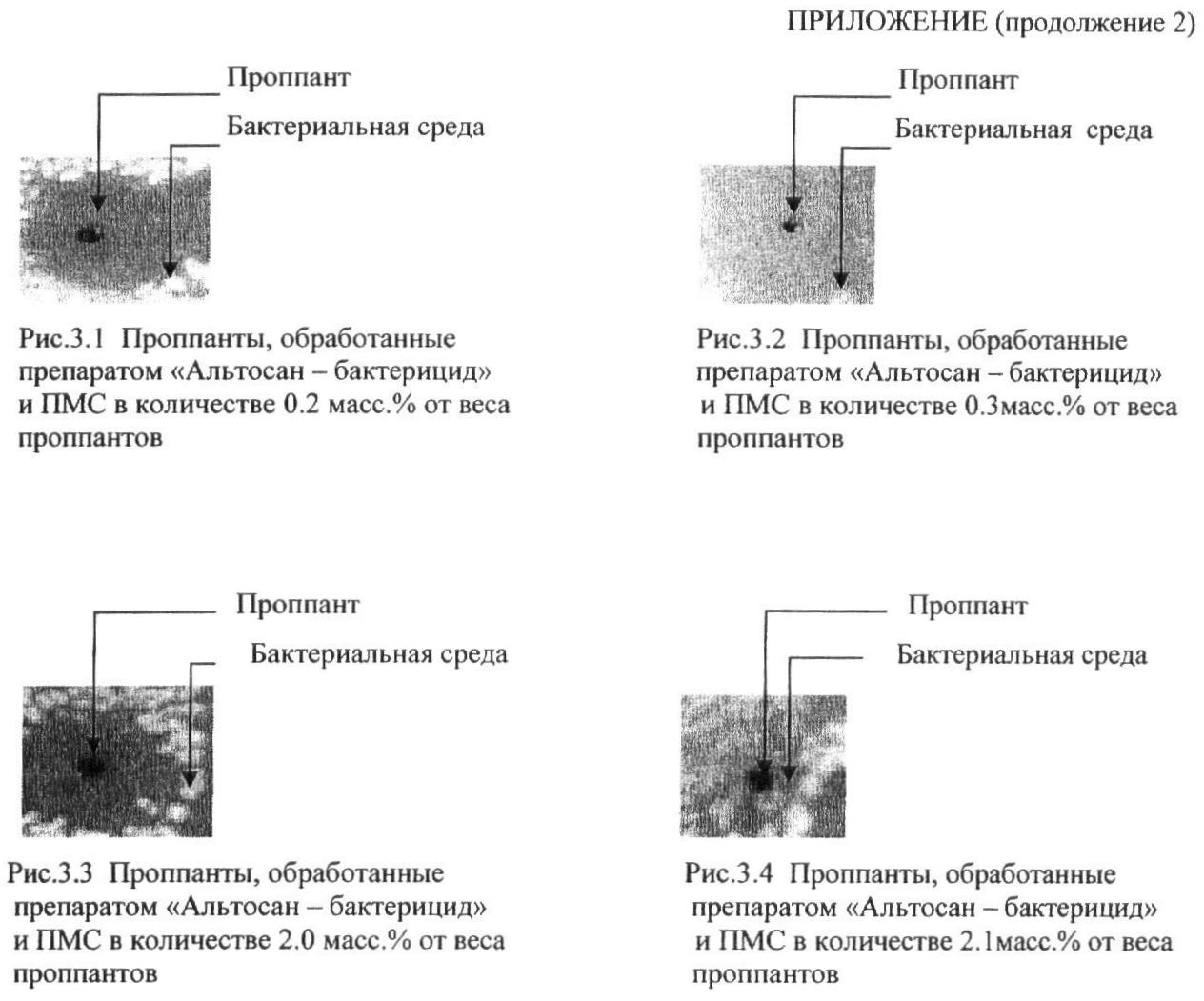 Из приведенных выше фотографий видно, что смачивание поверхности проппантов раствором бактерицида в количестве менее 0.2 мас.% в пересчете на активное вещество не препятствует образованию бактериальных колоний, как вокруг расклинивателей, так и на их поверхности, а применение раствора биоцида в количестве более 2.5 мас.% в пересчете на активное вещество не приводит к заметному улучшению антибактериальных свойств проппантов.