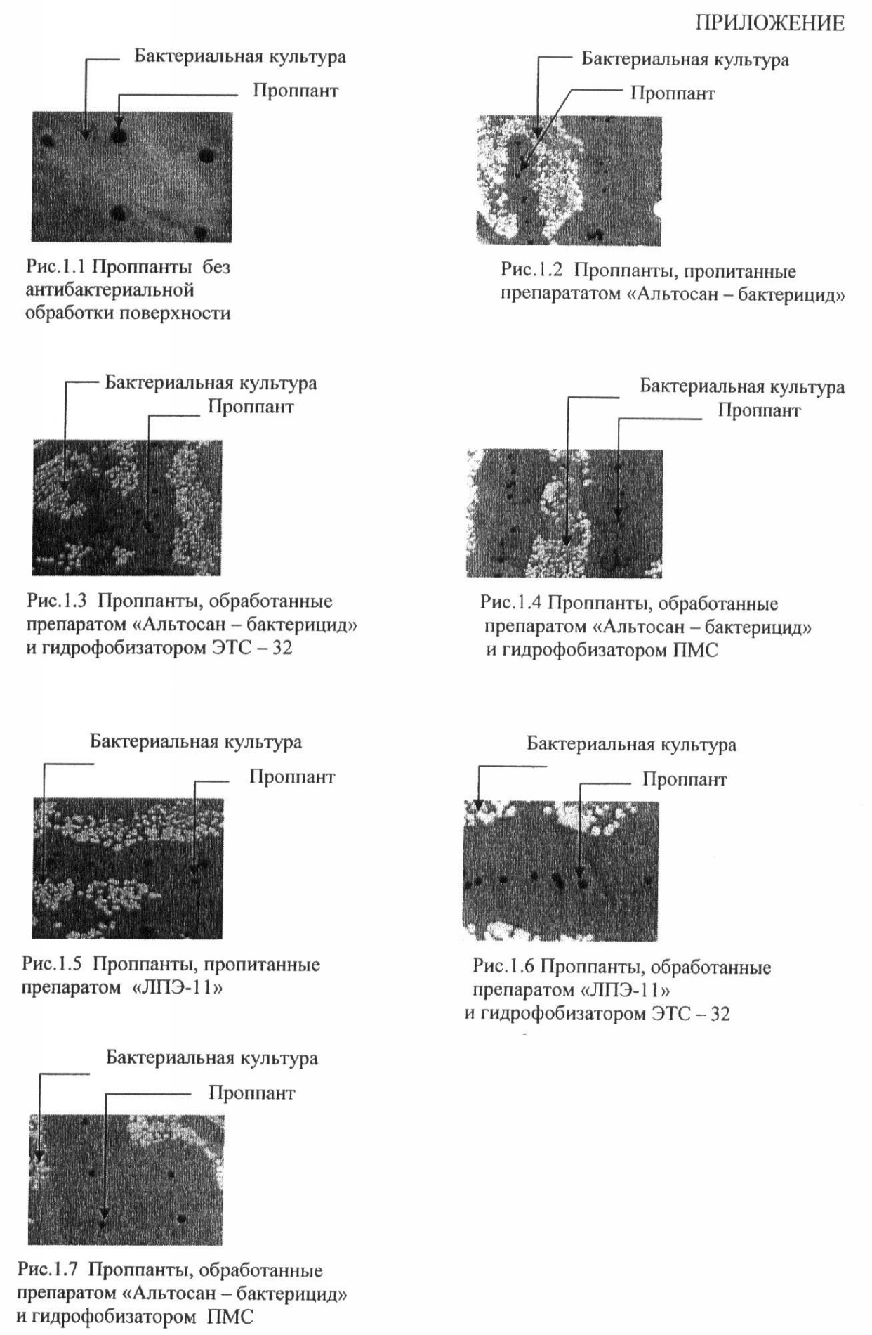 Анализ вышеприведенных фотографий показывает, что проппанты с антибактериальной поверхностью (рис.1.2-1.7) препятствуют развитию бактериальной культуры. Проппанты, обработанные бактерицидными препаратами и гидрофобизаторами (рис.1.3, 1.4, 1.6, 1.7), оказывают более выраженное биоцидное воздействие, чем проппанты, пропитанные препаратами «Альтосан – бактерицид» и «ЛПЭ-11». Это связано с тем, что при промывке проб проппантов горячей водой, бактерицидный препарат постепенно вымывается с поверхности гранул и антибактериальный эффект обеспечивается только за счет препарата, остающегося в порах.
