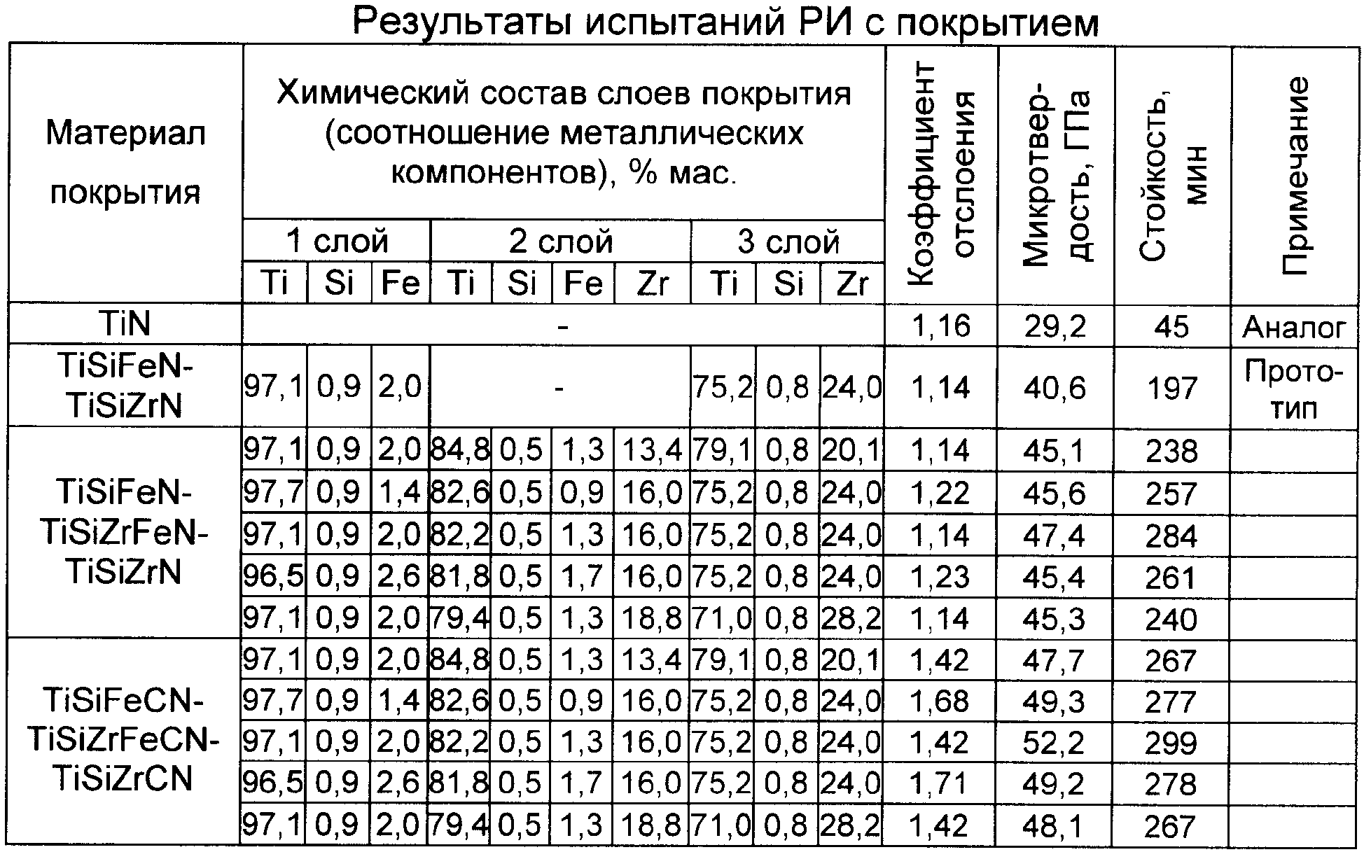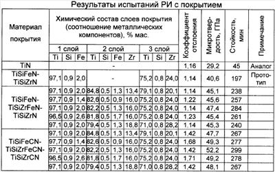 Изобретение относится к способам нанесения износостойких покрытий на режущий инструмент и может быть использовано в металлообработке. Известен способ повышения стойкости режущего инструмента (РИ), при котором на его поверхность вакуумно-плазменным методом наносят износостойкое покрытие (ИП) из нитрида титана (TiN) или карбонитрида титана (TiCN) (см. Табаков В.П. Работоспособность режущего инструмента с износостойкими покрытиями на основе сложных нитридов и карбонитридов титана. Ульяновск: УлГТУ, 1998. 123 с.). К причинам, препятствующим достижению указанного ниже технического результата при использовании известного способа, относится то, что в известном способе покрытия имеют относительно низкие твердость и недостаточную прочность сцепления с инструментальной основой. В результате этого покрытие в большей мере подвергается износу, в нем быстро зарождаются и распространяются трещины, приводящие к разрушению покрытия, что снижает стойкость РИ с покрытием. Наиболее близким способом того же назначения к заявленному изобретению по совокупности признаков является способ нанесения многослойного покрытия, раскрытый в описании к патенту на изобретение RU 2312166 С1, принятый за прототип. К причинам, препятствующим достижению указанного ниже технического результата при использовании известного режущего инструмента с покрытием, принятого за прототип, относится то, что в известном способе многослойное покрытие обладает недостаточной твердостью, а следовательно, трещиностойкостью. В результате покрытие плохо сопротивляется процессам износа и разрушения и быстро разрушается при резании. Повышение в последнее время стоимости металлорежущего инструмента и ужесточение требований к точности обрабатываемых деталей сделало еще более актуальной проблему повышения стойкости РИ. Одним из путей повышения стойкости и, как следствие, работоспособности РИ с покрытием является нанесение покрытий многослойного типа со слоями с различными физико-механическими свойствами. Наличие в покрытии верхнего слоя, обладающего высокой твердостью, способствует снижению интенсивности износа РИ с многослойным покрытием. Для повышения прочности сцепления покрытия с инструментальной основой оно должно иметь в своем составе нижний слой с повышенными адгезионными свойствами. Кроме того, увеличение твердости нижнего слоя покрытия также способствует дополнительному снижению интенсивности износа РИ с многослойным покрытием. Повышение прочности сцепления слоев обеспечивается за счет нанесения промежуточного слоя из элементов верхнего и нижнего слоев. Этот слой обладает высоким химическим сродством с другими слоями, высокой твердостью. Промежуточный слой также способствует повышению трещиностойкости за счет дополнительных границ между слоями. Технический результат – повышение работоспособности РИ. Указанный технический результат при осуществлении изобретения достигается тем, что наносят нижний слой из нитрида или карбонитрида соединения титана, кремния и железа при их соотношении, мас.%: титан 96,8-97,4, кремний 0,8-1,0, железо 1,8-2,2; промежуточный – из нитрида или карбонитрида соединения титана, кремния, циркония и железа при их соотношении, мас.%: титан 81,2-83,0, кремний 0,5-0,6, цирконий 15,3-16,7, железо 1,2-1,5; верхний – из нитрида или карбонитрида соединения 