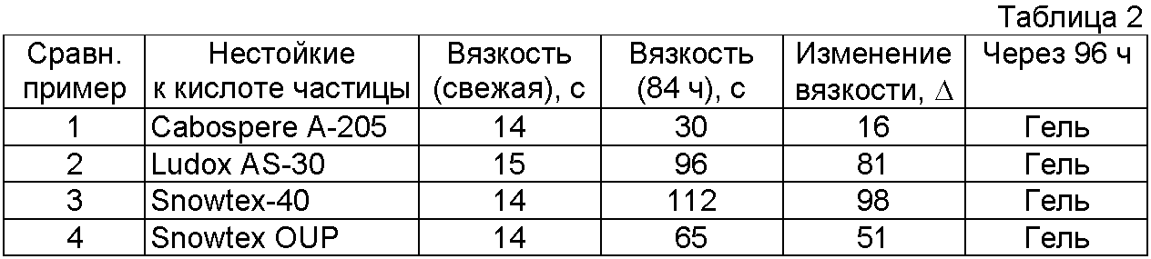 Экспериментальный способ, используемый для качественного определения стойких к кислоте частиц, включает определение изменения вязкости образца для испытаний более чем через 84 часа при комнатной температуре. Изменение вязкости определяют, применяя прибор Zahn Cup от Gardner Laboratory Division, Pacific Scientific Co.