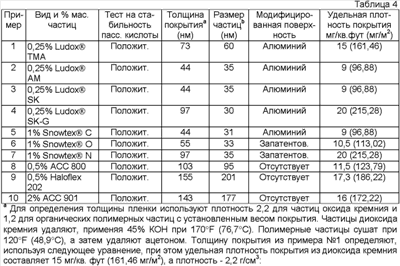Согласно одному из вариантов стойкие к кислоте частицы, применяемые в составе для нанесения покрытий, представляют собой частицы диоксида кремния, поставляемые в виде коллоидальной суспензии Grace Davison под товарным знаком Ludox® TMA, Ludox® AM, Ludox® SK и Ludox® SK-G. Указанные конкретные виды частиц диоксида кремния обрабатывают алюминиевым соединением, по всей вероятности алюминатом натрия. Например, Ludox® AM имеет весовое отношение