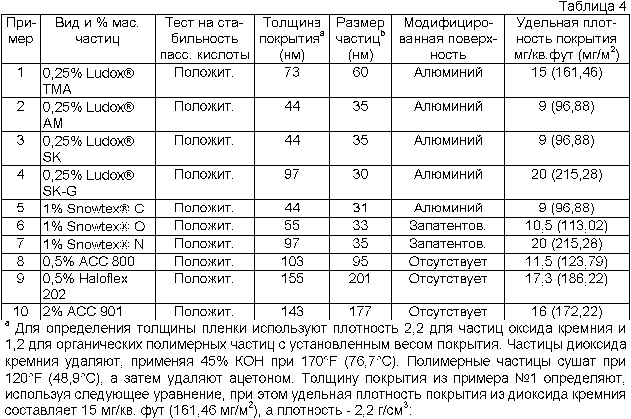 Как подтверждено сравнительными составами для нанесения покрытий, применение частиц диоксида кремния Ludox® AS, Ludox® HS и Ludox® TM не придает составам для покрытий кислотную стабильность, таким образом, указанные частицы не являются стойкими к кислоте частицами. Это не означает, что указанные нестойкие к действию кислоты частицы не могут присутствовать в составах для нанесения покрытий в соответствии с изобретением в относительно небольших количествах. Подразумевается, что количество или концентрация нестойких к кислоте частиц, которые могут присутствовать в составах для нанесения покрытий, зависит от вида указанных частиц, показателя рН состава, вида фторзамещенной кислоты, а также вида и концентрации стойких к кислоте частиц в композиции. Безусловно, рядовому специалисту в данной области техники понятно, что один или несколько различных видов стойких к кислоте частиц диоксида кремния могут быть соединены в составе для покрытий в соответствии с изобретением.