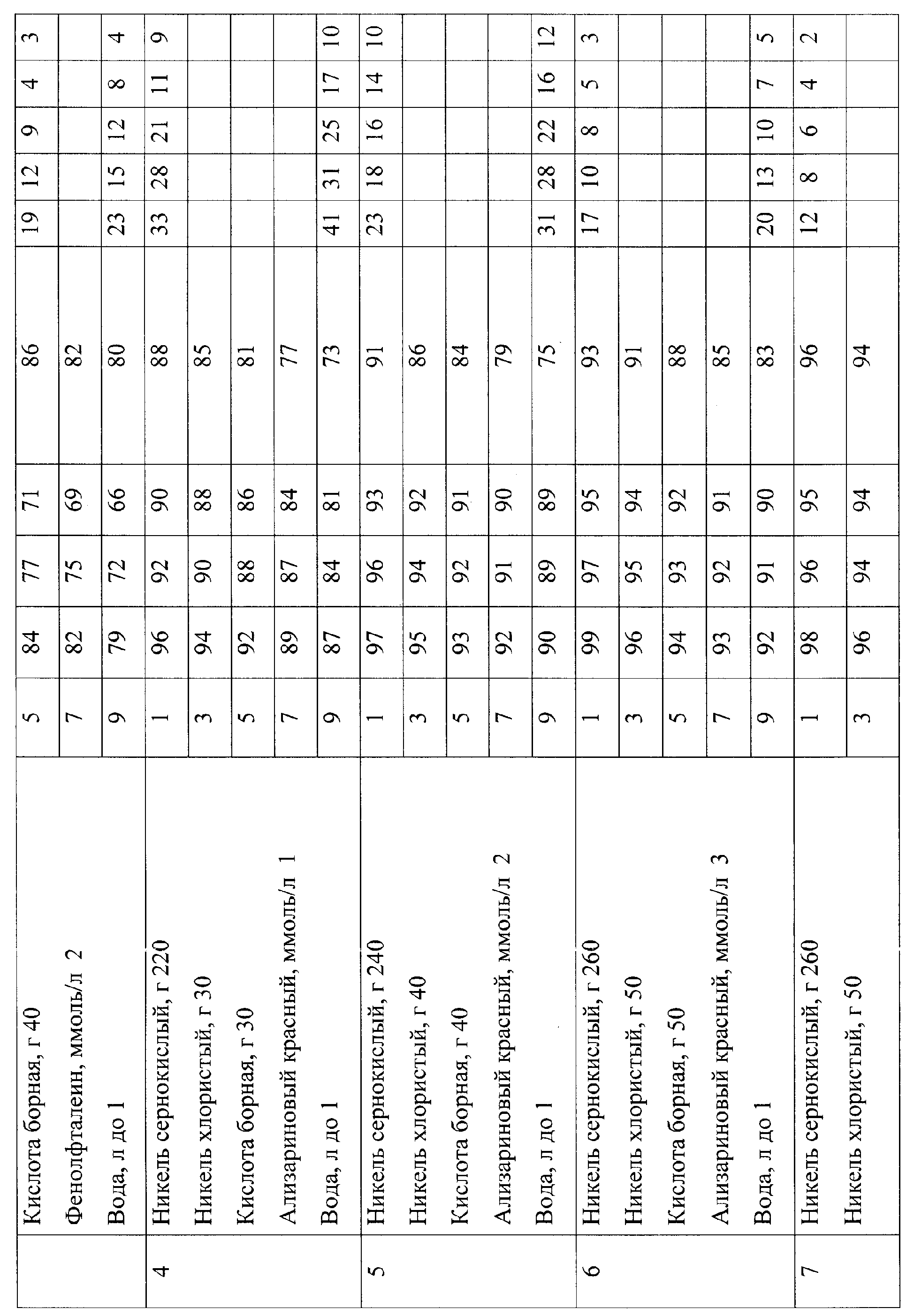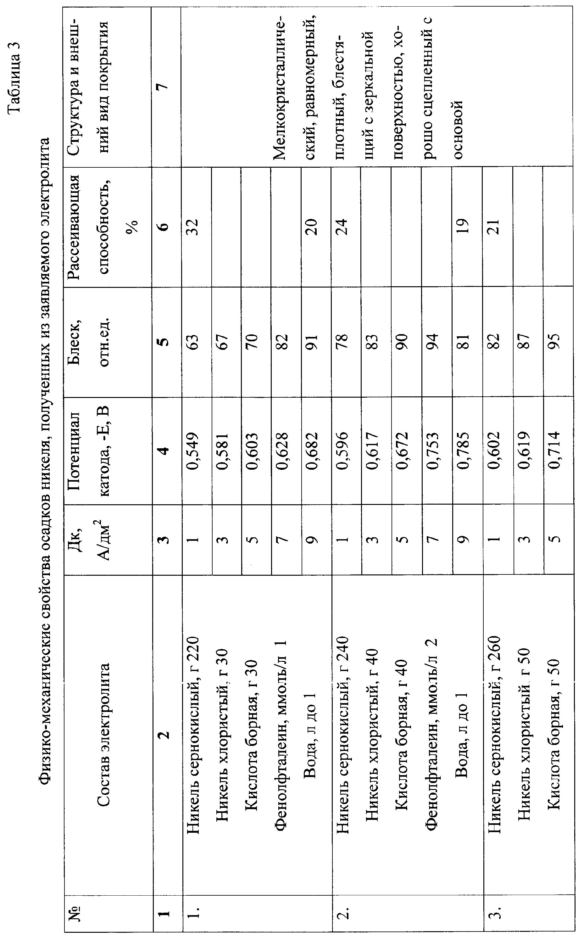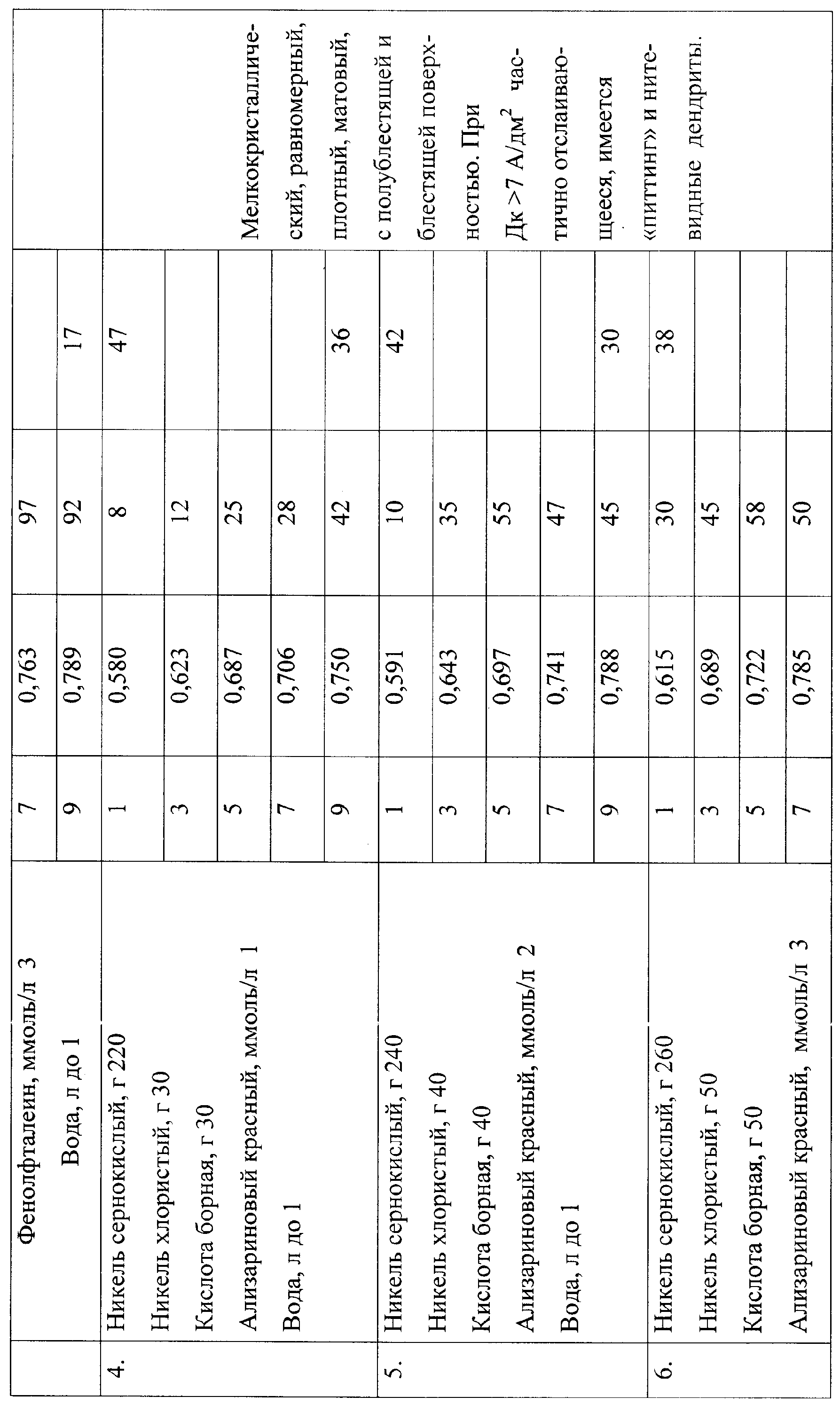 Приготовление электролита. Растворяют отдельно при температуре 40-50°С сернокислый и хлористый никель, борную кислоту, смешивают. Электролит прорабатывают при Дк=1А/дм2 в течение 4 часов для удаления примесей, фильтруют и прибавляют органические добавки. Все реактивы марки “х.ч.” и “ч.д.а.”. Наводороживание стали при электроосаждении никеля определяют по изменению пластичности стальной пружинной проволки из углеродистой стали У-10А диаметром 1 мм, длиной 130 мм, измеряемой числом оборотов до разрушения на машине К-5 с растягивающей нагрузкой 1,5 кг. Пластичность (N, %) стальных катодов определяют по формуле: N=(а/а0)·100%, где а и а0 – число оборотов до разрушения проволочного образца после и до никелирования. Подготовка образцов заключалась в полировке тонкой наждачной шкуркой и обезжиривании венской известью. Физико-механические свойства осадков никеля изучают на стальных пластинах 40×40×2 мм, одну сторону которой изолировали лаком. Водородосодержание в металле основы определяют методом анодного растворения, предложенным Клячко Ю.А. и Шкловской И.Ю. [2]. Блеск никелевых покрытий определяют на фотометрическом блескомере ФБ-2 по отношению к увиолевому стеклу, блеск которого составляет 65 отн.ед. Область значений 1-10 – матовой, 10-50 – полублестящей, 50-90 – блестящей, 90-100 – зеркальной. Потенциал катода измеряют на потенциометре Р-375, в качестве электрода сравнения применяли хлорсеребряный электрод. Пористость покрытий определяют по ГОСТу 9.302-79. Выход по току – с помощью медного кулонометра. Прочность сцепления (адгезия) покрытия с основой определяют нанесением взаимнопересекающихся царапин и скручиванием проволочных образцов. Внешний вид покрытия и структуру описывают с помощью микроскопа. Рассеивающая способность электролита определяют в ячейке Херинга-Блюма. Результаты экспериментального анализа представлены в табл.2, 3, и 4. Пример Электроосаждение никеля из сульфатного электролита сопровождается высокой катодной поляризацией, потенциал катода изменяется от -0,575 до -0,705 В (табл.2 и 3, Пример В качестве блескообразователя при никелировании применяют фенолфталеин. Блескообразующее действие этой добавке придают два атома кислорода, три ароматических бензольных кольца и две электроноакцепторные гидрокси группы и большая молекулярная масса вещества – 318. Потенциал катода сильно смещается в область отрицательных значений от 0,549 до 0,789 В (табл.3 и 2, Однако данная добавка не является ингибитором наводороживания. Пластичность сильно падает от 92 до 61%. Выход по току равен 70-93%. Объем поглощенного водорода составляет 9-91 мл/100 г металла (табл.4, Пример В качестве ингибитора наводороживания используют ализариновый красный, в присутствии которого пластичность стальных образцов составляет 81-99% при Дк=1-9 А/дм2 (табл.2, Потенциал катода в электролите в присутствии ализаринового красного изменяется от -0,580 до -0,798 В (табл.3, Пример Только совместное присутствие в электролите двух органических добавок – блескообразователя фенолфталеина и ингибитора наводороживания ализаринового красного обеспечивает получение качественных осадков с заданными свойствами. Потенциал катода изменяется от -0,600 до -0,930 В (табл 3, Анализ приведенных результатов показывает, что комплексное сочетание блескообразователя – фенолфталеина и ингибитора наводороживания – ализа