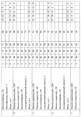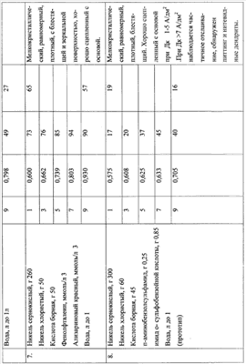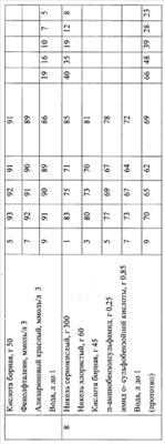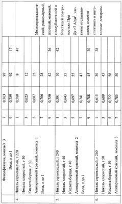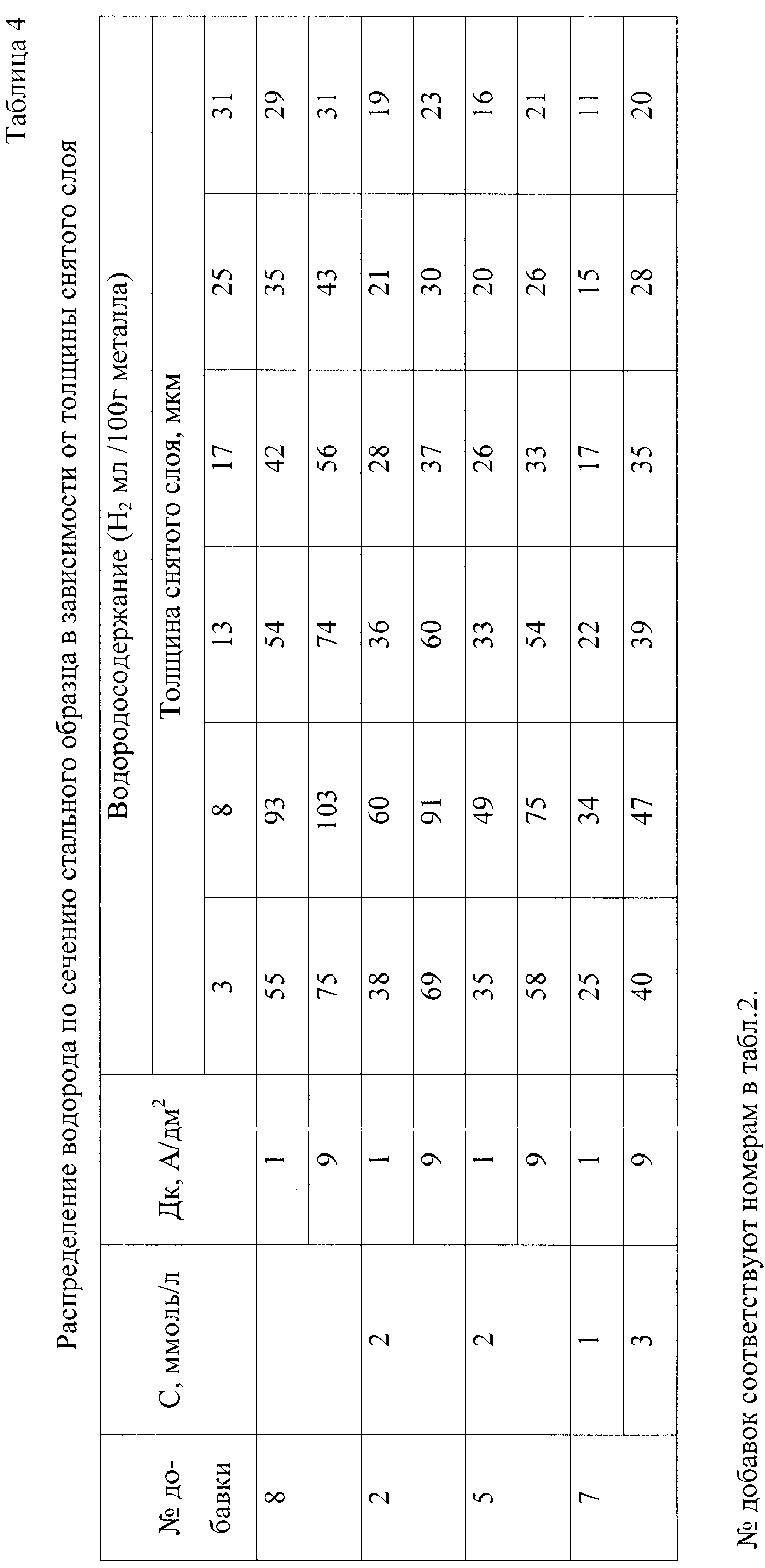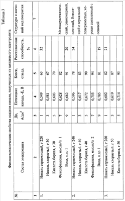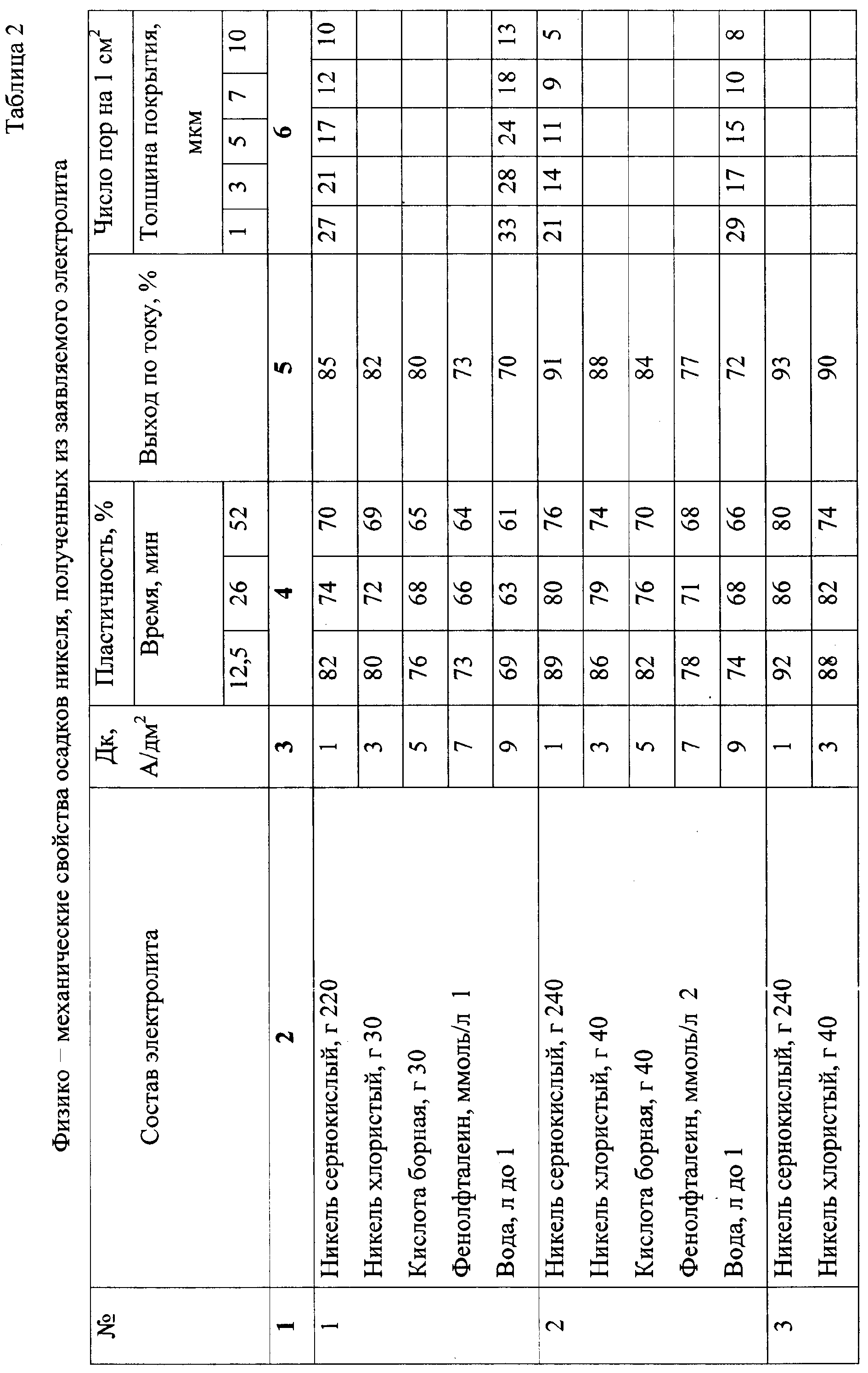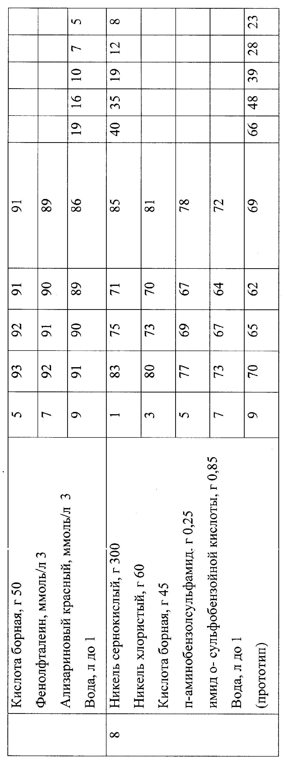 Приготовление электролита. Растворяют отдельно при температуре 40-50°С сернокислый и хлористый никель, борную кислоту, смешивают. Электролит прорабатывают при Дк=1А/дм2 в течение 4 часов для удаления примесей, фильтруют и прибавляют органические добавки. Все реактивы марки “х.ч.” и “ч.д.а.”. Наводороживание стали при электроосаждении никеля определяют по изменению пластичности стальной пружинной проволки из углеродистой стали У-10А диаметром 1 мм, длиной 130 мм, измеряемой числом оборотов до разрушения на машине К-5 с растягивающей нагрузкой 1,5 кг. Пластичность (N, %) стальных катодов определяют по формуле: N=(а/а0)·100%, где а и а0 – число оборотов до разрушения проволочного образца после и до никелирования. Подготовка образцов заключалась в полировке тонкой наждачной шкуркой и обезжиривании венской известью. Физико-механические свойства осадков никеля изучают на стальных пластинах 40×40×2 мм, одну сторону которой изолировали лаком. Водородосодержание в металле основы определяют методом анодного растворения, предложенным Клячко Ю.А. и Шкловской И.Ю. [2]. Блеск никелевых покрытий определяют на фотометрическом блескомере ФБ-2 по отношению к увиолевому стеклу, блеск которого составляет 65 отн.ед. Область значений 1-10 – матовой, 10-50 – полублестящей, 50-90 – блестящей, 90-100 – зеркальной. Потенциал катода измеряют на потенциометре Р-375, в качестве электрода сравнения применяли хлорсеребряный электрод. Пористость покрытий определяют по ГОСТу 9.302-79. Выход по току – с помощью медного кулонометра. Прочность сцепления (адгезия) покрытия с основой определяют нанесением взаимнопересекающихся царапин и скручиванием проволочных образцов. Внешний вид покрытия и структуру описывают с помощью микроскопа. Рассеивающая способность электролита определяют в ячейке Херинга-Блюма. Результаты экспериментального анализа представлены в табл.2, 3, и 4. Пример Электроосаждение никеля из сульфатного электролита сопровождается высокой катодной поляризацией, потенциал катода изменяется от -0,575 до -0,705 В (табл.2 и 3, Пример В качестве блескообразователя при никелировании применяют фенолфталеин. Блескообразующее действие этой добавке придают два атома кислорода, три ароматических бензольных кольца и две электроноакцепторные гидрокси группы и большая молекулярная масса вещества – 318. Потенциал катода сильно смещается в область отрицательных значений от 0,549 до 0,789 В (табл.3 и 2, Однако данная добавка не является ингибитором наводороживания. Пластичность сильно падает от 92 до 61%. Выход по току равен 70-93%. Объем поглощенного водорода составляет 9-91 мл/100 г металла (табл.4, Пример В качестве ингибитора наводороживания используют ализариновый красный, в присутствии которого пластичность стальных образцов составляет 81-99% при Дк=1-9 А/дм2 (табл.2, Потенциал катода в электролите в присутствии ализаринового красного изменяется от -0,580 до -0,798 В (табл.3, Пример Только совместное присутствие в электролите двух органических добавок – блескообразователя фенолфталеина и ингибитора наводороживания ализаринового красного обеспечивает получение качественных осадков с заданными свойствами. Потенциал катода изменяется от -0,600 до -0,930 В (табл 3, Анализ приведенных результатов показывает, что комплексное сочетание блескообразователя – фенолфталеина и ингибитора наводороживания – ализа