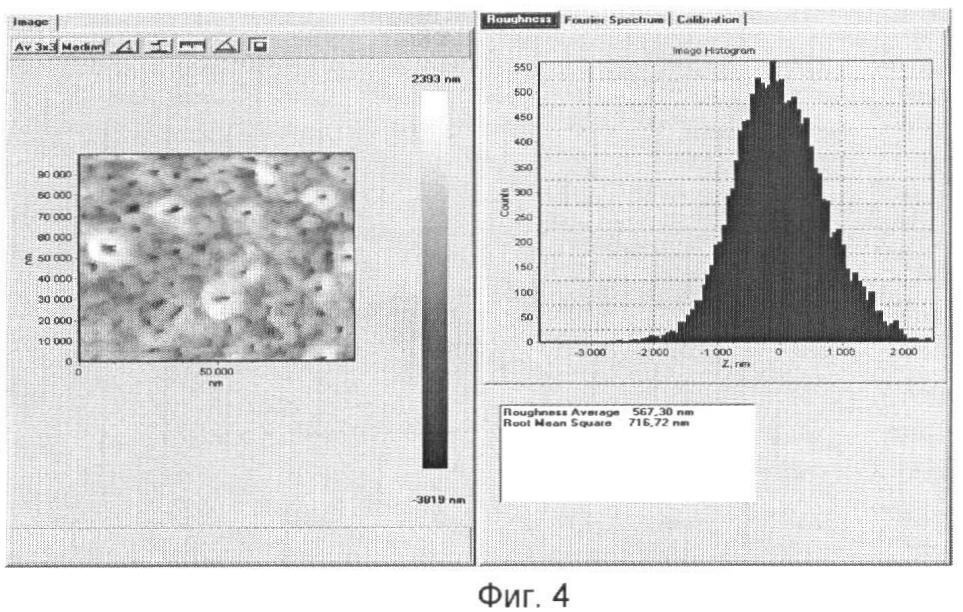 Исследование рельефа биоактивных покрытий, полученных при микродуговой обработке сплава титана ВТ-6 в электролите указанного выше состава показало, что данное покрытие имеет явно выраженную пористую структуру (Фиг.2, 3). Глубина пор изменяется от 1,4 мкм до 2 мкм. Средняя шероховатость составляет порядка 560 нм (Фиг.4).