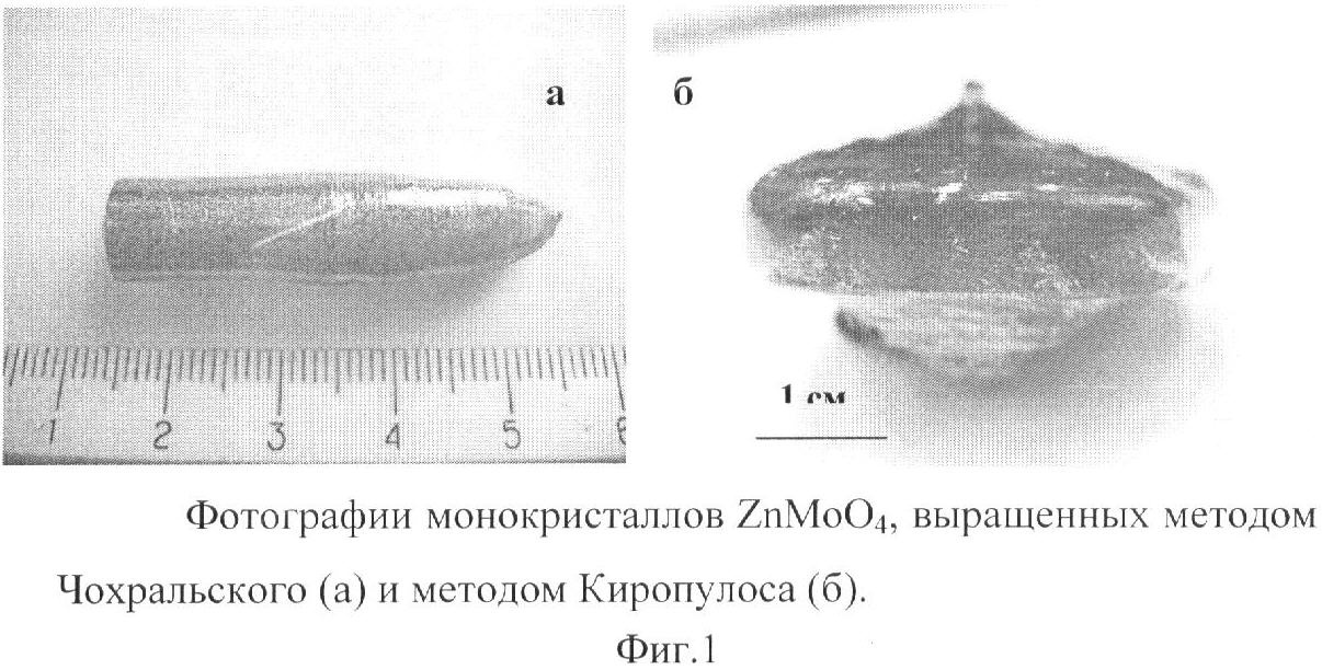 Техническим результатом изобретения является получение крупных монокристаллов ZnMoO4 (размером 1 см и более), имеющих оптическое качество, пригодных для работы в качестве сцинтилляционных детекторов и оптических элементов.