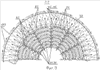 На фиг.1 изображена общая схема устройства охлаждения реактивного двигателя; на фиг.2 схематично изображен реактивный двигатель в статике; на фиг.3 – то же, в динамике; на фиг.4 – схематично изображен разрез А-А частей внешней стенки камеры сгорания реактивного двигателя; на фиг.5 схематично изображено профилированное кольцевое днище камеры сгорания, вид Б-Б, с лицевой стороны; на фиг.6 схематично изображена выдвижная свеча зажигания в статико-динамическом положении; на фиг.7 – то же, в динамике; на фиг.8 схематично изображен разрез В-В, частей цилиндрической части, внутренней цилиндрогрушевидной стенки, камеры сгорания; на фиг.9 схематично изображен вид Г-Г конусной части профилированной цилиндроконусной вставки, установленной на внутренней цилиндрогрушевидной стенке камеры сгорания, в динамике; на фиг.10 схематично изображен разрез Д-Д, промежуточной части, общего корпуса реактивного двигателя в статико-динамическом положении; на фиг.11 схематично изображен разрез регулятора состава окислителя в статике; на фиг.12 – то же, в динамике, подача в реактивный двигатель кислорода; на фиг.13 – то же, в динамике, подача в реактивный двигатель атмосферного потока и кислорода; на фиг.14 – то же, в динамике, подача в реактивный двигатель атмосферного потока; на фиг.15 – схематично изображен разрез А-А, вид сверху, показано перемещение давления атмосферного потока в полостях регулятора состава окислителя; на фиг.16 схематично изображен разрез Б, вид сверху, общей работы регулятора состава окислителя.