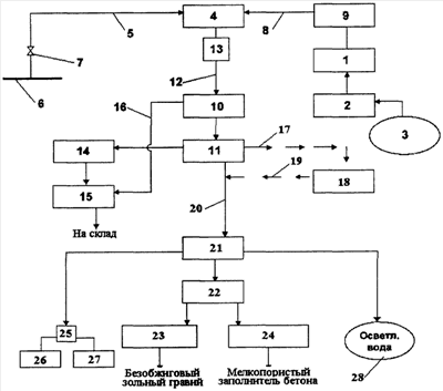 Пример реализации технологической линии для осуществления способа согласно изобретению. Для примера принята зола от сжигания Кузнецких каменных углей. Средний процентный состав основных оксидов: кремнезема – 58, глинозема – 26, кальция – 36, железа – 8. Фракционный состав золы в микронах в процентах: более 100 – 10, от 40 до 100 – 26, от 20 до 40 – 9, от 10 до 20 – 15, менее 10 – 40. Содержание шлака от 1 до 30 мм – 10%. Зола и шлак в количестве 60 т в час удаляются совместно по напорной линии 6 системы гидрозолоудаления. Отношение твердой и жидкой фаз золошлаковой пульпы при этом составляет Т:Ж=1:22. Запорный клапан 7 на линии 5 отвода пульпы к смесителю 4 установлен на расстоянии 200 м от насоса (не показан). Давление в линии 5 составляет 0,4 МПа, температура смеси 50°С. В смеситель 4 золошлаковая пульпа поступает непрерывно в количестве 1300 м3 в час через суживающееся сопло со скоростью 35 м/с. Из отвала 3 с помощью конвейерной системы 2 золошлаковая смесь подается в бункер 1 в количестве 45 т золы и 5 т шлака в час. Через дозатор-питатель 9 золошлаковая смесь из бункера 1 поступает в смеситель 4, повышая весовую консистенцию гидросмеси на выходе из него до Т:Ж=1:11. Принятая скорость подачи пульпы текущего поступления в смеситель 4 через суживающееся сопло обеспечивает интенсивную гидродинамическую активацию золошлаковых частиц. Из смесителя 4 смесь самотеком поступает в конусный грохот 10, на котором выделяется шлак в количестве 11 т в час. Поток гидросмеси, содержащий 99 т золы, поступает из грохота 10 в пластинчатый сгуститель 11, в верхней части которого размещено барабанное сито. При этом частицы размером более 50 мкм сгущаются на пластинах сгустителя, а гидросмесь с размером частиц менее 50 мкм уходит со сливом в нижерасположенный распределитель гидросмеси (не показан), равномерно распределявший гидросмесь между двумя параллельно включенными пластинчатых сгустителями 21. Сгущенная фракция крупной золы в количестве 36 т в час влажностью 30% подается конвейером 14 в смеситель 15, в который подается также 11 т отобранного на грохоте 10 шлака. Смешанная золошлаковая смесь направляется на реализацию потребителю. В сгустителях 21 площадью каждый по 500 м2 мелкая зола сгущается до влажности 35%, а вода, осветлялась до содержания в ней частиц размером не более 0,05 мкм, возвращается на электростанцию. Зола из нижней части сгустителей 21 поступает на реверсивный конвейер 22 с установленным над ним автоматическим измерителем содержания углерода в золе, соединенным с приводом этого конвейера (не показано). В рассматриваемом примере содержание несгоревшего угля в золе составляет 3%, и зола конвейером 22 подается в технологический модуль 23, где дополнительно обезвоживается на ленточном вакуум-фильтре до 12%, гранулируется при смешении с 10% цемента, после чего гранулы пропариваются с получением безобжигового зольного гравия насыпной плотностью 1080 кг/м3 при прочности (в цилиндре) 4 МПа. В сгустителях 21 при осветлении и сливе воды улавливаются полые микросферы, отбираемые поплавковым устройством, смонтированным в сгустителях. Вместе с микросферами улавливаются и частицы несгоревшего угля. Все уловленные частицы поступают самотеком в сепаратор 25, в котором микросферы отделяются от частиц угля и обезвоживаются на пресс-фильтре (не показан). В рассматриваемом примере производительность технолог
