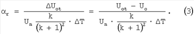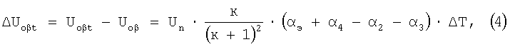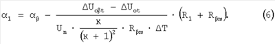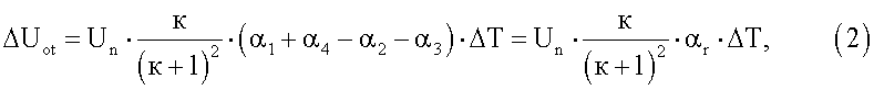 Тогда, учитывая, что при нормальной температуре начальный выходной сигнал датчика Uo, из выражения (2) можно определить ТКС мостовой цепи Кроме того, для определения номинала компенсационного термозависимого резистора в соответствии с выражением (1) необходимо выразить через выходные сигналы ТКС компенсационного резистора Для этого в выбранное плечо мостовой цепи включают технологический компенсационный термозависимый резистор R После установки технологического компенсационного резистора в мостовую цепь производят повторную балансировку при нормальной температуре, в пределах ±0,5% номинального выходного сигнала датчика, без изменения ТКС балансируемого плеча, например путем лазерной или электроэрозионной подгонки тензорезистора, расположенного в смежном плече мостовой схемы относительно плеча установки R Тогда, согласно (2), девиация начального разбаланса датчика от температуры, при установке технологического термозависимого резистора, например, в плечо R1, будет иметь вид: где ТКС плеча R1, после подключения технологического компенсационного резистора, в соответствии с (см. Патент на изобретение RU 2265802 C1, G01В 7/16, «Способ настройки тензорезисторных датчиков с мостовой измерительной цепью по аддитивной температурной погрешности», зарегистрированный 10.12.2005 г.) будет иметь вид: