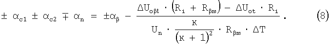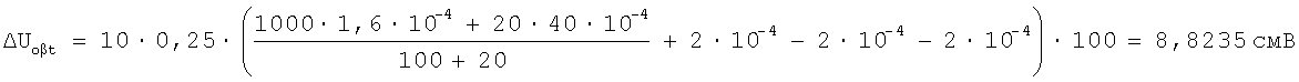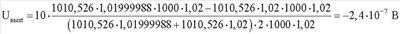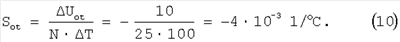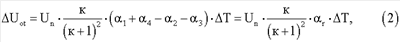 Вычитая уравнение (2) из выражения (4) и решая относительно ТКС плеча R1, получим: Полученное выражение справедливо при подключении технологического компенсационного резистора в плечи мостовой цепи, воспринимающие деформацию растяжения (то есть в плечи R1 или R4). Если провести подобные вычисления для установки R Знаки (+) и (-) по верхнему ряду ставятся при подключении R Подставляя выражение (7) в уравнение (2) и решая относительно выражения ± Знаки (+) и (-) по верхнему ряду ставятся при подключении R Подставляя выражения (3) и (8) в формулу (1), можно определить величину компенсационного термозависимого резистора, необходимого для компенсации аддитивной температурной погрешности датчика с учетом влияния момента затяжки, физических параметров элементов измерительной цепи и расширения газа, загерметизированного во внутренней полости датчика, через выходные сигналы и известное значение технологического термозависимого элемента Полученное значение компенсационного термозависимого резистора устанавливается в измерительную цепь путем частичного задействования технологического компенсационного термозависимого резистора, установленного в датчике, с последующей окончательной балансировкой мостовой цепи без изменения ТКС балансируемого плеча, например путем лазерной или электроэрозионной подгонки тензорезистора, расположенного в противолежащем плече мостовой схемы. При выводе аналитического выражения для расчета номинала компенсационного термозависимого резистора R Для оценки эффективности данного способа компенсации проведем расчет компенсационного резистора и оценим температурную погрешность после проведения компенсации. Пример расчета резистора R Исходные данные: – номинал тензорезисторов равноплечей цепи R1=R2=R3=R4=1000 Ом; – ТКС мостовой цепи – напряжение питания Un=10 В; – номинал технологического компенсационного резистора R – номинальное значение относительного изменения сопротивления датчика – изменение температуры в процессе эксплуатации – допустимое значение аддитивной температурной чувствительности Sot=1·10-4 1/°С. Решение Для решения задачи необходимо задаться изменением начального выходного сигнала от воздействия температуры Тогда, согласно (2) и (4), можно рассчитать девиацию начальных выходных сигналов датчика для заданных характеристик сбалансированной мостовой цепи при подключении и без подключения технологического компенсационного резистора в плечо R1 (плечо, выбрано исходя из отрицательного значения