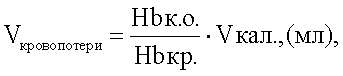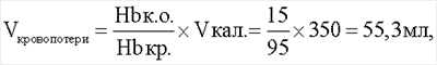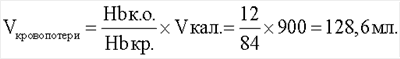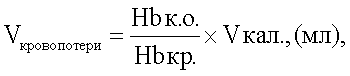 где Vкровопотери – объем крови в кишечном отделяемом, (мл), Нb к.о – содержание гемоглобина в кишечном отделяемом, Нb кр. – содержание гемоглобина в периферической крови пациента, V кал. – суточный объем кишечного содержимого (мл). По вычисленной величине объема кровопотери пациента при толстокишечном кровотечении определяют тактику медикаментозного или хирургического лечения толстокишечного кровотечения. При объеме кровопотери в течение суток менее 100 мл проводят консервативную терапию, уточняют диагностику и применяют эндоскопические методы остановки кровотечения. При объеме кровопотери в течение суток более 100 мл или неэффективности указанных мероприятий проводят срочное хирургическое лечение. Среди существенных признаков, характеризующих предложенный способ количественного определения объема кровопотери пациента при толстокишечных кровотечениях, отличительными являются: – предварительное определение содержания гемоглобина (Нb кр.) в периферической крови пациента по стандартному гемиглобин-цианидному методу, – сбор кишечного отделяемого за сутки пациента с толстокишечным кровотечением, его гомогенизация и определение его объем (V кал.), – отбор пробы гомогенизированного кишечного отделяемого пациента в количестве 1 мл и добавление в нее 3 мл дистиллированной воды для гемолиза имеющихся в пробе эритроцитов, – интенсивное встряхивание полученной смеси в течение 0.5-1 мин и отстаивание в течение 10-12 мин, – центрифугирование смеси при скорости 1200-2000 об/мин и отбор гемолизата в виде надосадочной жидкости, отделенной от взвеси не растворимых составляющих пробы, – смешивание отобранного гемолизата в соотношении 1:50 с трансформирующим раствором, содержащим феррицианид калия, цианид калия, дигидрофосфат калия и неионный детергент, и отстаивание в течение 10-15 мин, – измерение относительной фотометрической оптической плотности (А) исследуемого раствора при длине волны – умножение полученной величины относительной фотометрической оптической плотности (А) исследуемого раствора на унифицированный коэффициент гемиглобинцианидного метода пересчета, равный 74,74, с получением содержания гемоглобина (Нb к.о.) в исследуемом растворе, – вычисление объема крови в кишечном отделяемом пациента по формуле