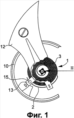 на фиг.1 показан вид сверху с частичным вырывом подпружиненного балансира, снабженного балансирной пружиной, в соответствии с изобретением;