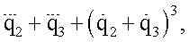 На чертежах введены следующие обозначения: qвх – сигнал желаемого положения; qi – соответствующие обобщенные координаты исполнительного органа робота ; qi – скорости изменения соответствующих обобщенных координат ; – ошибка привода (величина рассогласования); m1, m2, m3, mг – соответственно, массы первого, второго, третьего звеньев исполнительного органа и захваченного груза; (i=2,3) – расстояния от оси вращения соответствующего звена до его центра масс; (i=2,3) – длины соответствующих звеньев; , – соответственно скорость и ускорение вращения ротора двигателя первой степени подвижности; U*, U – соответственно усиливаемый сигнал и сигнал управления двигателем 5.