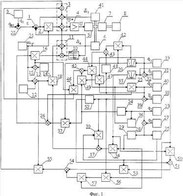 Известен самонастраивающийся электропривод робота, содержащий последовательно соединенные первый сумматор, первый блок умножения, второй сумматор, усилитель и двигатель, связанный с первым датчиком скорости непосредственно и через редуктор с шестерней, первый датчик положения, последовательно соединенные релейный блок и третий сумматор, второй вход которого подключен к выходу первого датчика скорости, входу релейного блока и к второму входу первого сумматора, последовательно соединенные первый задатчик сигнала и четвертый сумматор, последовательно соединенные второй задатчик сигнала, пятый сумматор и второй блок умножения, последовательно соединенные шестой сумматор и третий блок умножения, выход которого подключен к третьему входу третьего сумматора, последовательно соединенные второй датчик скорости и первый квадратор, а также датчик массы, причем вход устройства соединен с первым входом седьмого сумматора, подключенного вторым входом к выходу первого датчика положения, а выходом – к первому входу первого сумматора, выход третьего сумматора соединен со вторым входом второго сумматора, выход датчика массы соединен со вторым входом первого блока умножения, а выход первого сумматора соединен с третьим входом второго сумматора, последовательно соединенные второй датчик положения, первый функциональный преобразователь, четвертый блок умножения и восьмой сумматор, выход которого подключен ко второму входу второго блока умножения, последовательно соединенные третий датчик положения, девятый сумматор, второй функциональный преобразователь и пятый блок умножения, выход которого подключен к первому входу шестого сумматора, последовательно соединенные третий датчик скорости, десятый сумматор, второй вход которого подключен к выходу второго датчика скорости, второй квадратор и шестой блок умножения, выход которого подключен ко второму входу шестого сумматора, а его второй вход через третий функциональный преобразователь – к выходу девятого сумматора, последовательно соединенные четвертый функциональный преобразователь, вход которого подключен к выходу второго датчика положения и второму входу девятого сумматора, и седьмой блок умножения, второй вход которого подключен к выходу первого квадратора, а выход – ко второму входу восьмого сумматора, последовательно соединенные первый датчик ускорения и одиннадцатый сумматор, второй вход которого подключен к выходу второго датчика ускорения и к второму входу четвертого блока умножения, а его выход – ко второму входу пятого блока умножения, причем выход датчика массы подключен ко вторым входам четвертого и пятого сумматоров, выход второго блока умножения – к четвертому входу третьего сумматора, а выход четвертого сумматора – ко второму входу третьего блока умножения, отличающийся тем, что первый и второй функциональные преобразователи реализуют функцию cos, а третий и четвертый функциональные преобразователи – функцию sin (см. патент РФ 2272313, БИ 8, 2006).