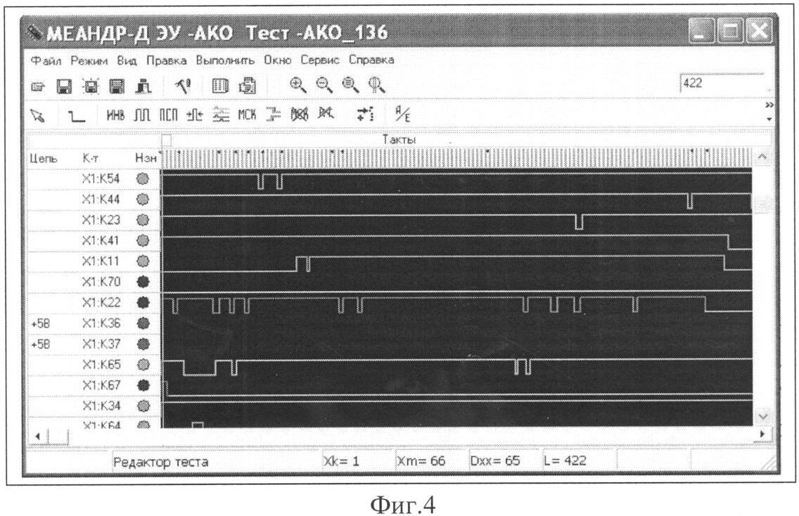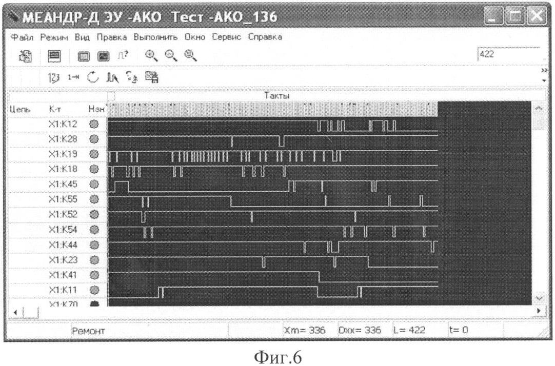 После загрузки диагностического теста в микроЭВМ 23-25 начинается его выполнение. Процесс выполнения теста разбивается во времени на отдельные такты. В каждом такте микроЭВМ 23-25 выдает через свои контроллеры 23.3 ввода/вывода и адаптер 26 на входы диагностируемого РЭИ 28 различные уровни напряжения (логические 1 и логические 0). А затем через определенную задержку времени производит считывание ответных реакций с выходов РЭИ в ОЗУ выходных контроллеров 23.3 микроЭВМ 23-25. Поток загруженных данных в каждый контроллер 23.3 ввода/вывода содержит информацию о логических уровнях напряжения, которое должно быть подано на каждый вход РЭИ 28, и о логических уровнях ответных реакций, которые должны установиться на каждом выходе исправного РЭИ 28 (так называемых эталонных реакций). После считывания реакций каждая микроЭВМ 23-25 начинает производить анализ реакции на наличие короткого замыкания или перенапряжения на каждом входе РЭИ 28, а затем на совпадение реакции с эталонными реакциями на каждом выходе РЭИ 28. Здесь следует подчеркнуть, что в отличие от известных программно-диагностических комплексов анализ выходных реакций производится в микроЭВМ 23-25, а не в компьютере 11. Если при анализе обнаруживается короткое замыкание на каком-либо входе РЭИ 28, то контроллер 23.3 ввода/вывода выдает команду на перевод всех своих выходных каналов в высокоимпедансное состояние, останавливает дальнейшую отработку теста, выдает сигнал останова другим контроллерам 23.3 ввода/вывода микроЭВМ 23-25 и передает сообщение в компьютер 11. Компьютер 11, приняв данное сообщение, выдает на экран монитора 1 сообщение оператору: «ОБНАРУЖЕНО КОРОТКОЕ ЗАМЫКАНИЕ НА КОНТАКТЕ В ТАКТЕ  ». Если в процессе анализа обнаруживается несовпадение выходных реакций с эталонными реакциями, то контроллер 23.3 ввода/вывода соответствующей микроЭВМ 23-25 генерирует информацию о результатах анализа и помещает ее в свое ОЗУ ЦП23.2 и затем переходит к следующему такту теста. По окончании выполнения диагностического теста все обнаруженные несовпадения передаются через интерфейс 23.1 УСАП и микросхему 20 интерфейса USB-2.0 в компьютер 11. Компьютер 11 анализирует коды реакции, сравнивает с эталонными реакциями, хранящимися в эталонных файлах памяти управляющей ЭВМ 2 для данного РЭИ 28. Если несовпадений не обнаружено, то выдается сообщение «ИЗДЕЛИЕ ИСПРАВНО». Если в результате анализа будут обнаружены несовпадения принятых реакций от РЭИ 28 с эталонными, то компьютер 11 останавливает прогон диагностического теста, выдает на экран монитора 1 сообщение: «Брак изделия» и выдает данные, по каким выходам РЭИ 28 были получены неправильные реакции. Если несовпадений не обнаружено, то тест проходит до конца и выдается сообщение «Изделие исправно». На этом диагностика РЭИ 28 заканчивается. По окончании прогона диагностического теста компьютер 11 выводит на экран монитора 1 информацию о состоянии диагностируемого РЭИ 28, т.е. исправно или не исправно данное изделие 28 и по каким выходам обнаружена неправильная реакция. Далее для ремонта неисправного РЭИ 28 необходимо определить его неисправный элемент. Для обнаружения неисправного элемента схемы РЭИ 28 оператор запускает диагностический тест в режиме «Ремонт» (фиг.6). В этом режиме тест прогоняется без остановки. При обнаружении неправильной реакции на каком-либо выходе и