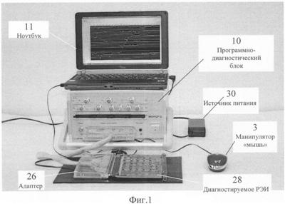 Задачей изобретения является создание переносного программно-диагностического комплекса, пригодного для разработки контрольных (диагностических) тестов, диагностики и дефектации (отбраковки неисправных) РЭИ на основе контрольных тестов, обнаружения мест локализации неисправностей в дефектных РЭИ в интересах замены неисправных элементов и восстановления работоспособности РЭИ непосредственно в местах эксплуатации последних без вызова ремонтных бригад с дорогостоящими мобильными комплексами.