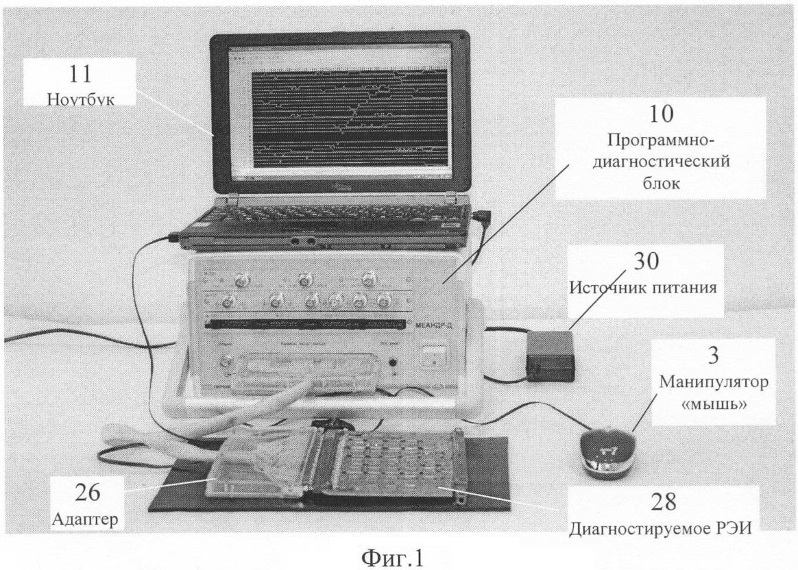 Перед началом работы программно-диагностического комплекса диагностируемое радиоэлектронное изделие (РЭИ) 28 подключают к адаптеру 26 через соответствующие разъемы. Адаптер 26 подключают к диагностическому модулю 9 через кабель 30. На диагностируемое РЭИ 28 подается питающее напряжение от источника 29 постоянного нестабилизированного напряжения через вторичный преобразователь постоянного напряжения, установленного на плате адаптера 26. Оператор программно-диагностического комплекса с помощью органов управления 3-4 компьютера 11 запускает программу тестовой диагностики, которая управляет работой программно-диагностического блока 10 в режимах «Разработка диагностического теста», «Диагностика» и «Ремонт», а также вызывает программы «Цифровой осциллограф», «Генератор сигналов», «Логический анализатор», которые используются при поиске неисправных элементов в РЭИ.