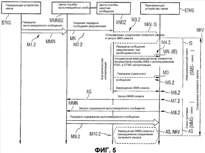 На фиг. 5 показана, исходя из фиг. 3 и 4, последовательность этапов с М1.2 по М10.2 в связи с передачей мультимедийного сообщения MMN от передающего устройства STKG связи к принимающему устройству ETKG связи в стационарной/мобильной сети FМN, причем центр MMNDZ службы мультимедийных сообщений и центр службы коротких сообщений KNDZ являются двумя отдельными, например, пространственно отделенными один от другого центрами обслуживания. Прежде всего согласно первому этапу М2.1 мультимедийное сообщение MMN передается от передающего устройства STKG связи к центру MMNDZ службы мультимедийных сообщений и там, предпочтительно до момента времени, когда мультимедийное сообщение доставляется к приемнику (в данном случае к принимающему устройству ETKG связи), промежуточным образом сохраняется в хранилище HLS. Согласно второму этапу М2.2 центр MMNDZ службы мультимедийных сообщений инициирует посылку сообщения MN уведомления, так называемого MMS-уведомления, к принимающему устройству ETKG связи, после чего не показанный на чертеже шлюз-посредник рассылки (PPG) центра MMNDZ службы мультимедийных сообщений передает сообщение MN уведомления в центр службы коротких сообщений (KNDZ).