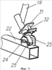 Такие же пластины 31 с пальцем 32, предназначенным для фиксации секций разбрызгивателя в разложенном положении, закреплены на передней ножке 19 треноги около цилиндрического шарнира 24, соединяющего ножку 19 с балкой 22 клетки.