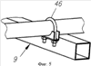 Клетка 9 сзади снабжена поперечиной 44 для опоры нижних штанг 27 средних звеньев опрыскивателя в сложенном его положении. Спереди клетка 9 снабжена рамкой 45 для опоры штанг 36 и 37 крайних звеньев при их установке над кабиной 2 в транспортном положении опрыскивателя, то есть при поездке к обрабатываемому полю и при возвращении с поля. В транспортном положении штанги 27 и штанги 36, 37 зафиксированы хомутами 46 (фиг.5), соединенными с клеткой.