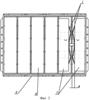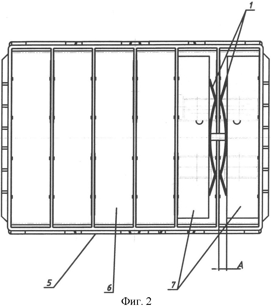 Установка фиксирующих пластин выполняется следующим образом. В сборочном цехе сначала в отсеки корпуса батареи вставляются попарно соединенные фиксирующие пластины 1. Затем вставляются блоки электродных пластин 7, поджимая фиксирующие пластины 1. Такая установка блоков электродных пластин исключает удары блоков о днище корпуса, что, в свою очередь, исключает повреждения и проколы сепараторов. При приварке крышки к корпусу батареи переплавляются места перегиба 3 перемычек 2 и крышка плотно приваривается к верхним торцам стенок корпуса батареи.