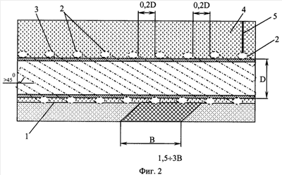 Способ сооружения подземного трубопровода на пересечении тектонических разломов осуществляют следующим образом. Отрывают траншею 1. Укладывают в нее трубопровод 3 с закрепленными с его внешней стороны лотками 2, выполненными в виде цилиндрических замкнутых оболочек. Оболочки 2 могут быть выполнены из шлангов с установкой на них заглушек и патрубков. Цилиндрические замкнутые оболочки 2 закрепляют по винтовой линии на трубопроводе 3 в заводских условиях по длине сварного участка трубопровода, например с помощью клея, либо другого известного способа. Диаметр оболочки 2 принимают равным 0,15D, где D – внешний диаметр трубопровода, м, для обеспечения достаточно надежной фиксации трубопровода 3 относительно грунта 4 при накачке оболочки 2 сжатым воздухом. Расстояние между соседними витками принимают равным 0,2D для обеспечения режима эффективных деформаций оболочки 2 под влиянием тектонических сил. Оболочки 2 устанавливают на трубопроводе в зоне тектонического разлома шириной В с перекрытием этой зоны более чем в 4 раза по длине трубопровода, что позволит повысить надежность эксплуатации трубопровода 3. Угол наклона витков к горизонтали принимают не менее 45° для обеспечения эффективного гашения сил, действующих на трубопровод 3 при сейсмическом воздействии. При необходимости, например при большой ширине В, соединяют оболочки 2 друг с другом патрубками (не показаны), которые в свою очередь соединяют с воздуховодом 5 с выводом конца воздуховода 5 на поверхность для контроля за давлением воздуха и подкачки его в случае необходимости. Контроль за давлением и подкачку сжатого воздуха осуществляют периодически с записью показаний в журнал учета. Затем заполняют оболочки 2 сжатым воздухом и засыпают трубопровод 3 с оболочками 2 грунтом 4. При проявлении тектонической активности за счет деформации лотков 2, выполненных в виде цилиндрических замкнутых оболочек, происходит снижение силового воздействия на трубопровод 3, тем самым практически исключаются его возможные деформации.