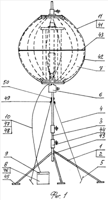 Источник 7 освещения выполнен в виде объемного замкнутого абажура с оболочкой 11, изготовленной из эластичного воздуховлагонепроницаемого материала, с каркасом 12 с осветительными лампами 13 (в примере исполнения с одной электрической лампой (натриевыми/металлогеновыми от 12 до 2000 Вт, со световым потоком до 180000лм и уровнем освещения до 12000 кв.м). Каркас 12 выполнен в виде цилиндрического объема, основанием которого является установочный фланец 14 с отверстиями 15 для охлаждения, связанный посредством стержней 16 с отражательной пластиной 17 с отверстиями 18 для охлаждения. Каркас 12 выполнен с защитной решеткой 19, образованной множеством жестких металлических прутков, равномерно размещенных вдоль и поперек образующих линий цилиндра, с кронштейном 20 и патроном 21 для установки лампы 13. Каркас 12 с защитной решеткой 19 препятствует соприкосновению оболочки 11 с лампой 13. Сверху на отражательной пластине 17 неподвижно (любым известным способом) закреплена муфта 22, в которую устанавливают и закрепляют фиксатором 23 центрирующий стержень 24, проходящий по высоте оболочки 11 и выходящий вверх за оболочку 11 через верхнее отверстие 25 в оболочке 11. Верхняя часть оболочки 11 размещена между ограничительной пластиной 26, размещенной внутри оболочки 11, и между верхней кольцевой пластиной 27, размещенной над оболочкой 11, связанными крепежными элементами 28. Сверху ограничительной пластины 26 с установкой на центрирующем стержне 24 закреплена крепежными элементами 29 муфта 30 с фиксатором 31. Нижняя часть оболочки 11 закреплена между установочным фланцем 14, размещенным внутри оболочки 11, и нижней кольцевой пластиной 32, связанными крепежными элементами 33. Снизу установочного фланца 14 крепежными элементами 34 закреплена крепежная стойка 35 для установки на поворотном шарнире 6 с фиксатором 36. Крепежная стойка 35 проходит через нижнее отверстие 37 оболочки 11. По краю сторон, размещенных вовнутрь оболочки 11 ограничительной пластины 26 и установочного фланца 14, равномерно закреплены шарнирные соединения 38 с переходниками 39, в которые устанавливаются зонтообразные спицы 40 с расположением сверху вниз от ограничительной пластины 26 к установочному фланцу 14. Блок 8 электронного управления с кнопочным пультом 9 управления, кабелем 10 связанный с источником 7 освещения, может быть установлен на каркасе 12, может быть установлен в нижней части у телескопического штатива 3, может быть установлен на корпусе электростанции (не показано), может быть установлен в отведенном месте на спецтехнике (не показано) (фиг.1, 2).