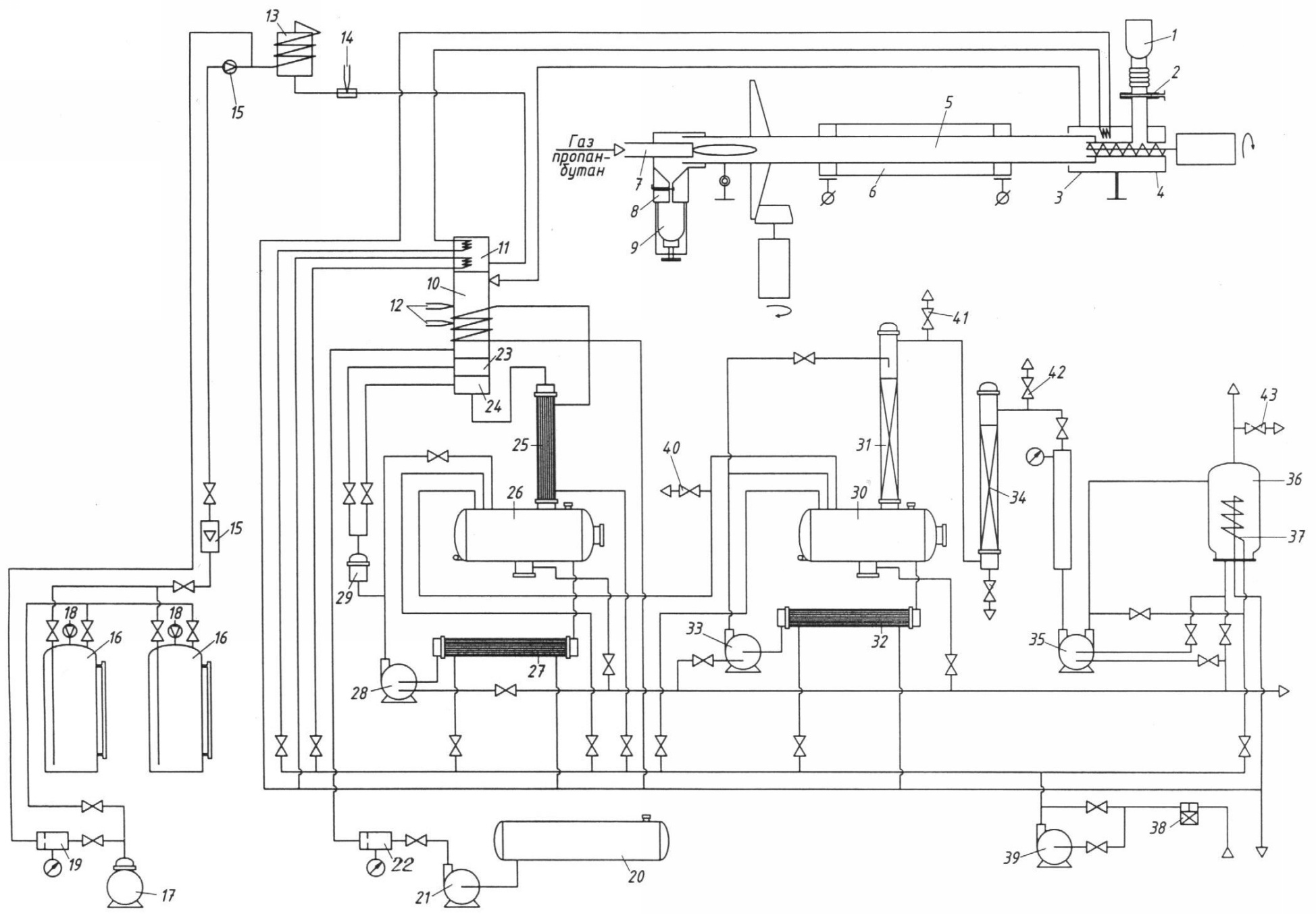 Температура газового потока на выходе из закалочного устройства поддерживается на уровне не выше 100°С. Пройдя устройство, газовый поток с раствором через теплообменник 25 поступают в емкость 26. В закалочные устройства раствор подается из емкости 26 через теплообменник 27 насосом 28 через фильтр 29. Отделенные отходящие газы из емкости 26 направляются через емкость 30 в абсорбер 31 насадочного типа с кольцами из полиэтилена размером 16×16×2, с целью их доочистки жидкими поглотителями. Абсорбент в колонну подается через теплообменник 32 насосом 33. От насоса 33 предусмотрен частичный возврат раствора в емкость 30, с целью поддержания в ней заданной температуры раствора. Газы, прошедшие абсорбционную очистку, поступают в адсорбер 34. В случае образования и накопления в нижней части колонны конденсата, предусмотрен его слив через вентиль. Из адсорбера 34 очищенные газы с помощью вакуумного насоса 35 водокольцевого типа через емкость оборотного водоснабжения 36 системы вакуумирования выбрасываются в атмосферу. Для поддержания температурного режима оборотной воды в емкости 36 предусмотрен змеевик 37. Поступающая на установку вода предварительно проходит очистку на фильтре 38. Насос 39 служит для поддержания требуемого давления воды в системе водопотребления работающей установки. Отбор отходящих газов с целью контроля их состава производят через четыре пробоотборника 40, 41, 42, 43.